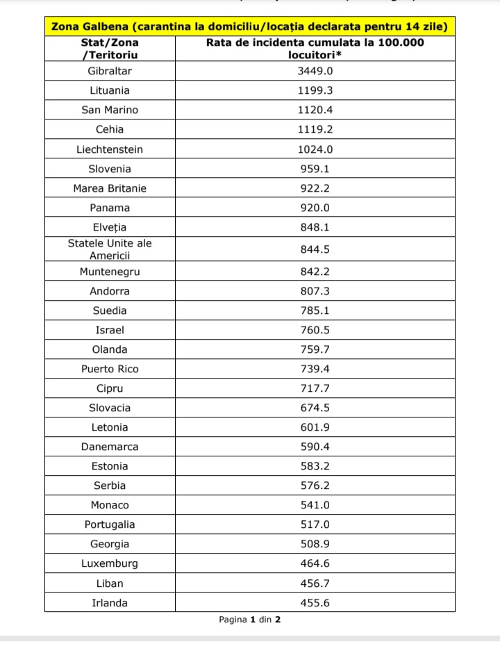 Art.2 – Se aprobă lista țărilor/zonelor/teritoriilor de risc epidemiologic ridicat pentru care se instituie măsura carantinei asupra persoanelor care sosesc în România din acestea, prevăzută în anexa nr. 1.