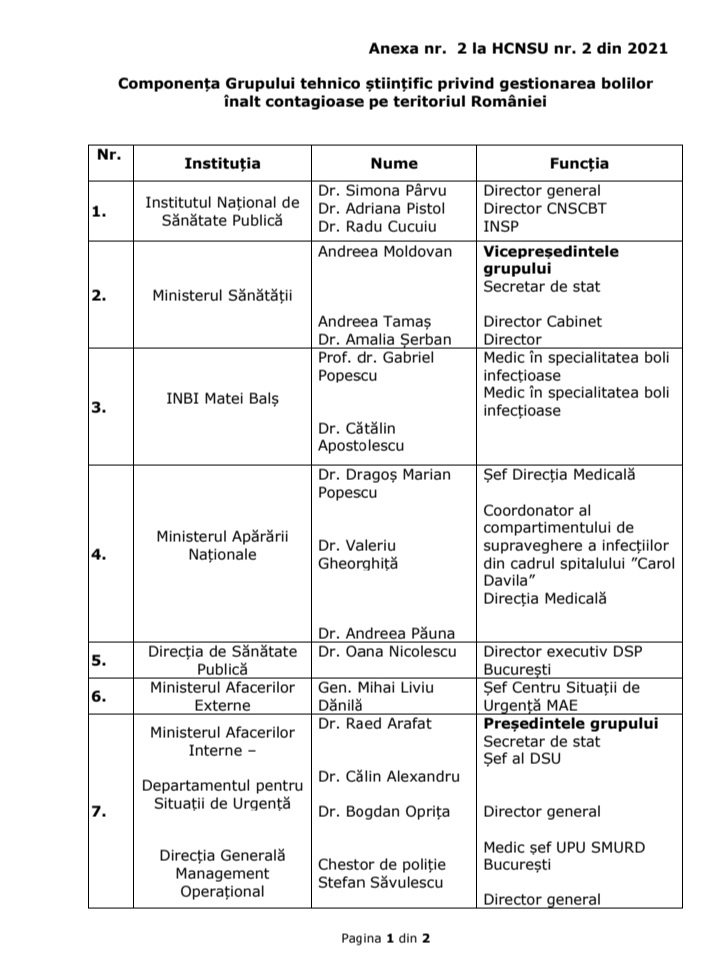 Totodată a fost actualizată componența Grupului de suport tehnico-științific privind gestionarea bolilor înalt contagioase pe teritoriul României.