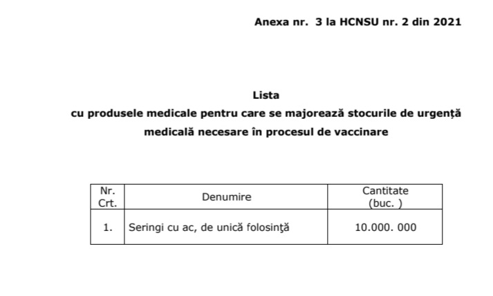 Art.4 – Se aprobă majorarea cantităților stocurilor de urgență medicală cu produse, materiale și echipamente sanitare necesare în procesul de vaccinare a populației împotriva virusului SARS-CoV-2, conform prevederilor anexei, nr. 3.