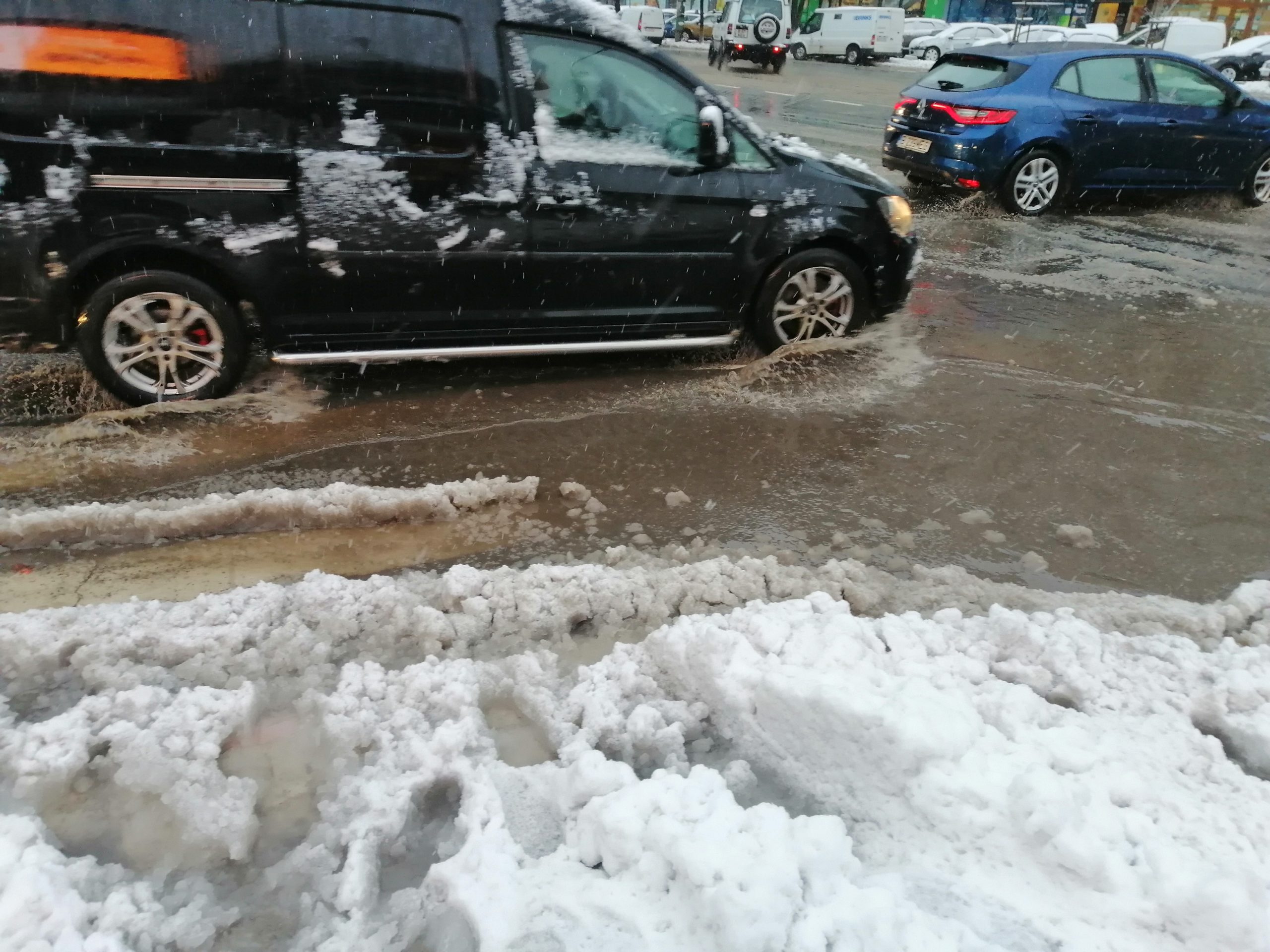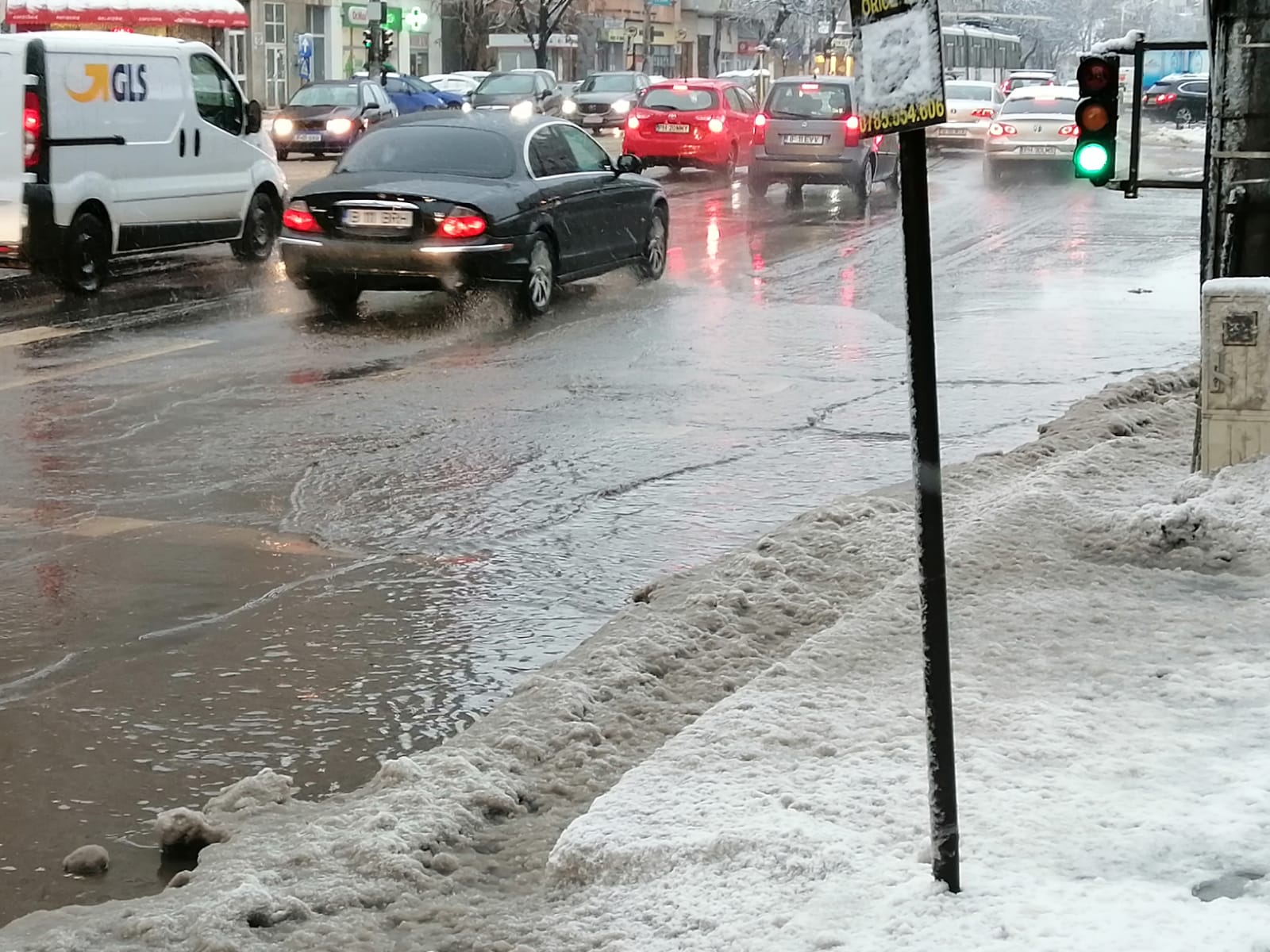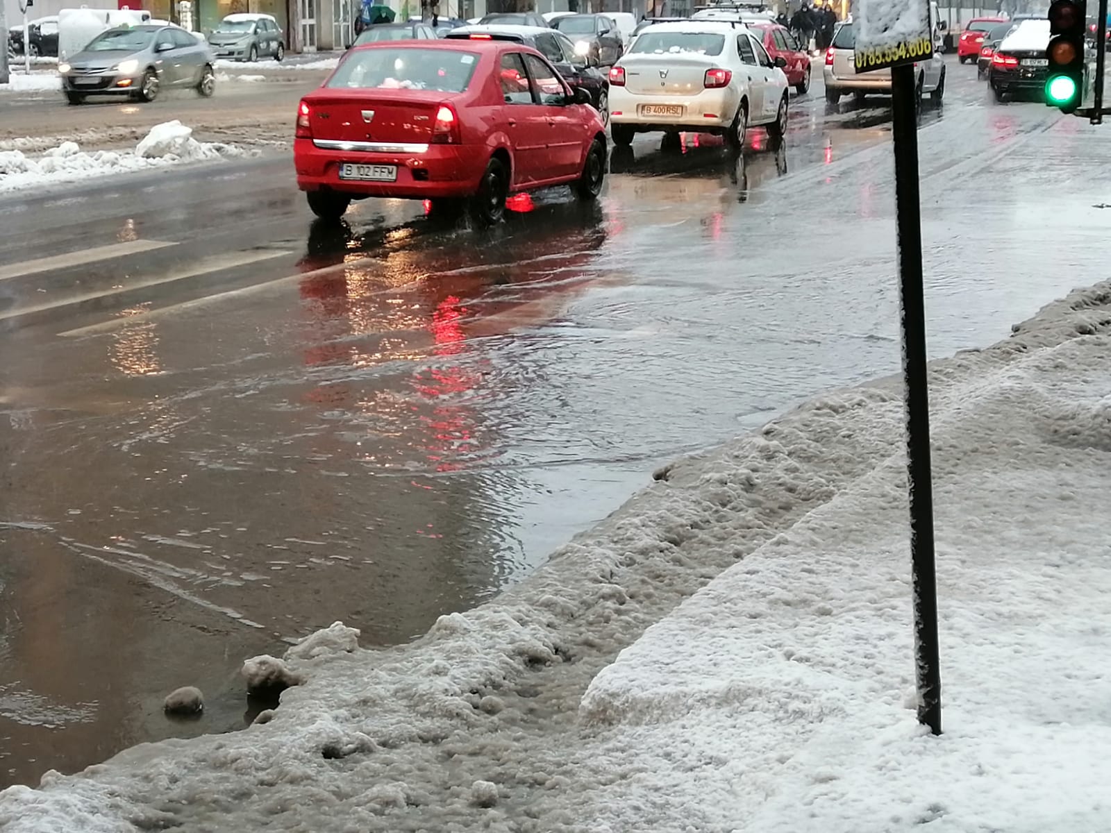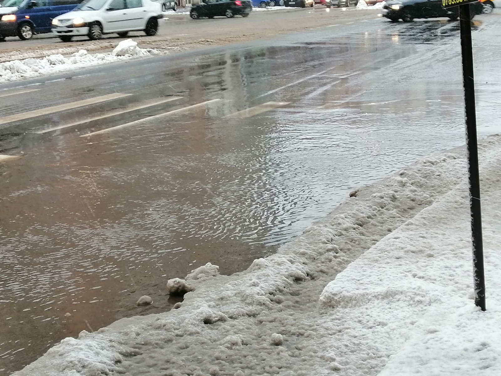 În schimb, pe trotuare și la marginea acestora s-au format acumulări mari de apă. Multe dintre ele sunt adevărate lacuri glaciare, la suprafața cărora plutește zăpadă murdară și în care te scufunzi până deasupra gleznelor. Când trec mașinile pe banda întâi împroașcă apa murdară a “lacurilor glaciare” asupra pietonilor care așteaptă culoarea verde a semaforului pentru a traversa sau mijloacele de transport în comun, în stații.