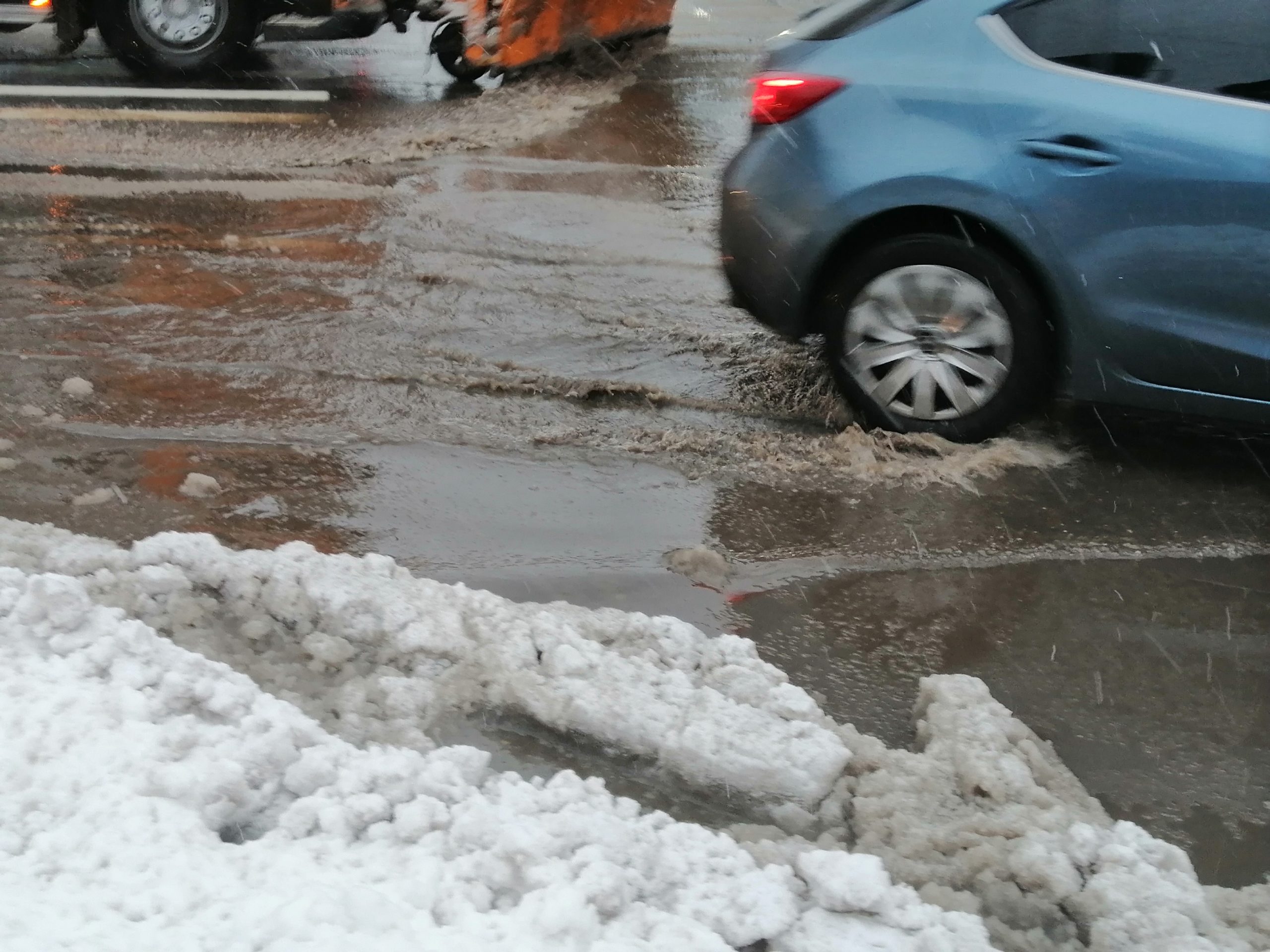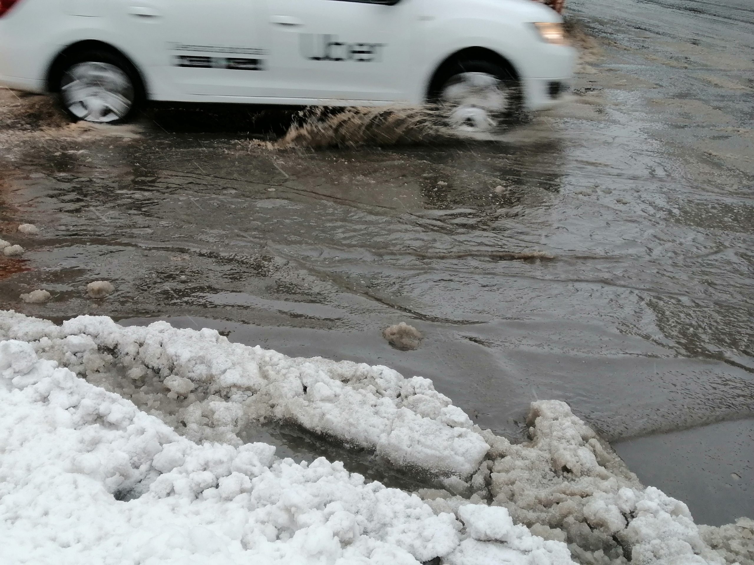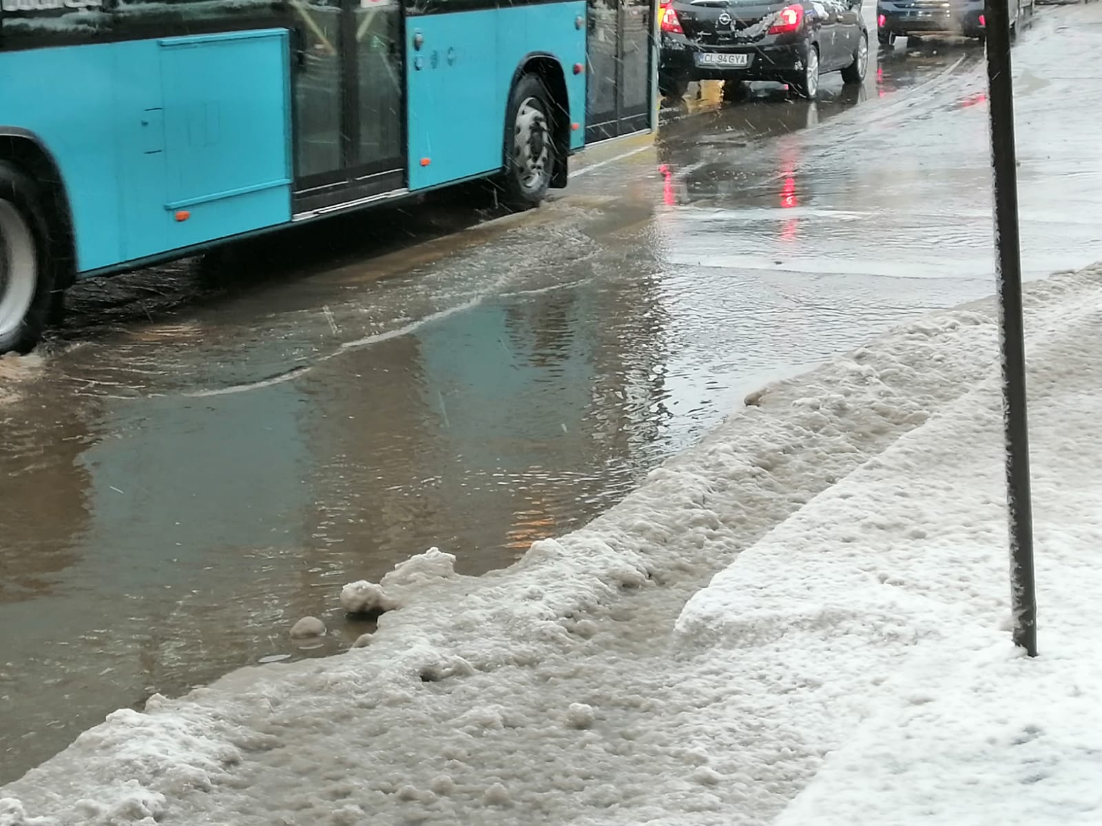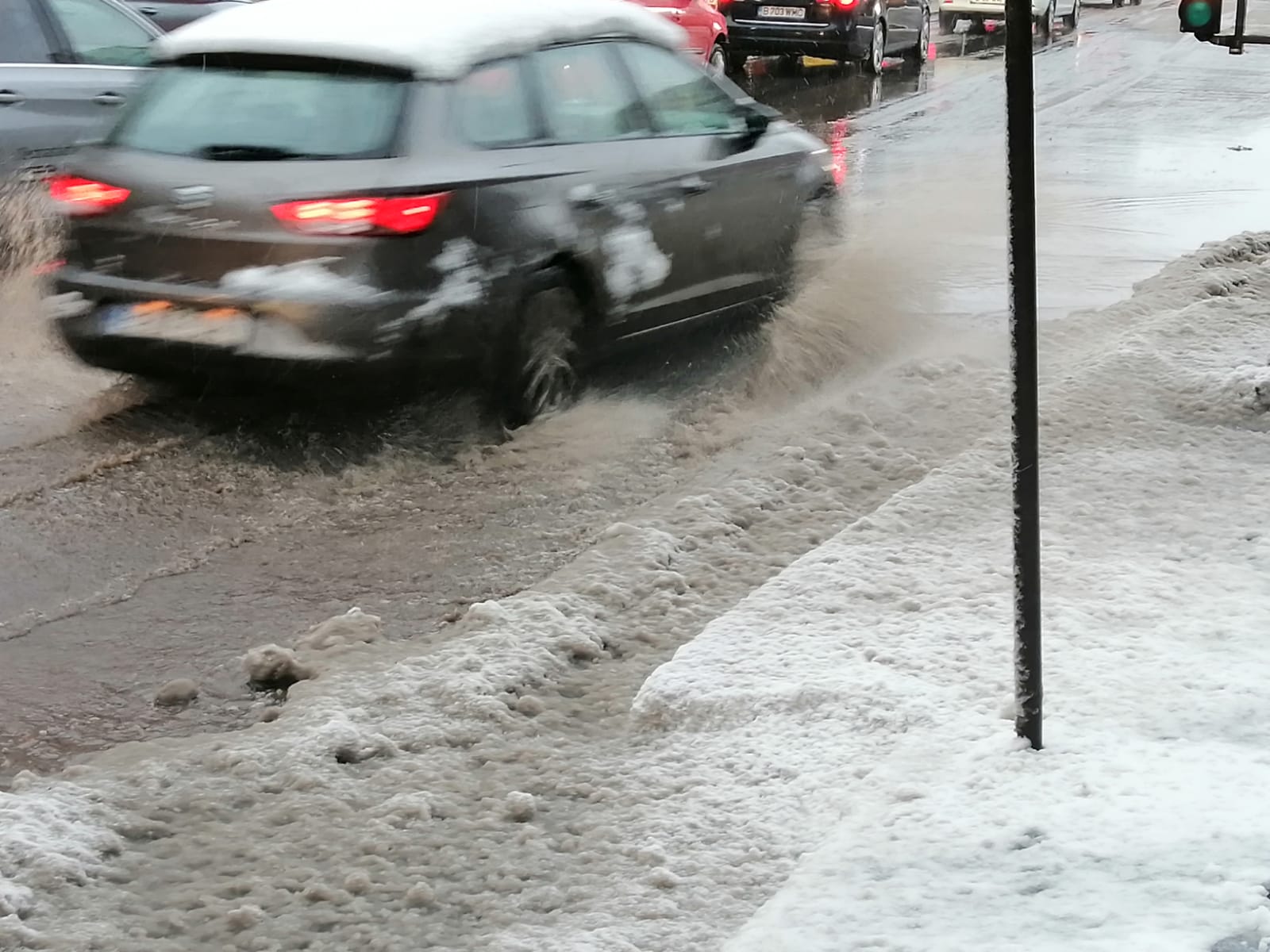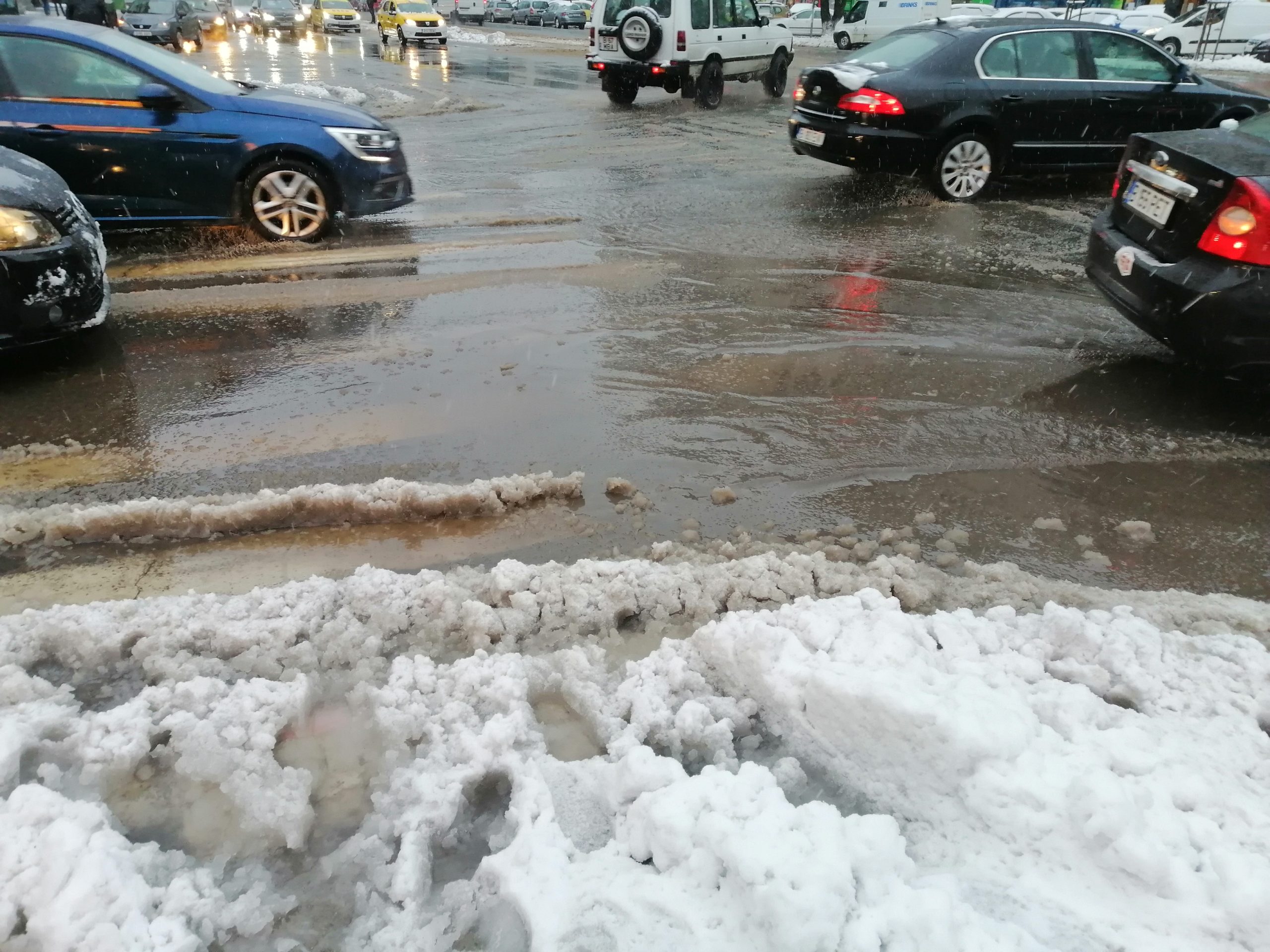 În schimb, pe trotuare și la marginea acestora s-au format acumulări mari de apă. Multe dintre ele sunt adevărate lacuri glaciare, la suprafața cărora plutește zăpadă murdară și în care te scufunzi până deasupra gleznelor. Când trec mașinile pe banda întâi împroașcă apa murdară a “lacurilor glaciare” asupra pietonilor care așteaptă culoarea verde a semaforului pentru a traversa sau mijloacele de transport în comun, în stații.