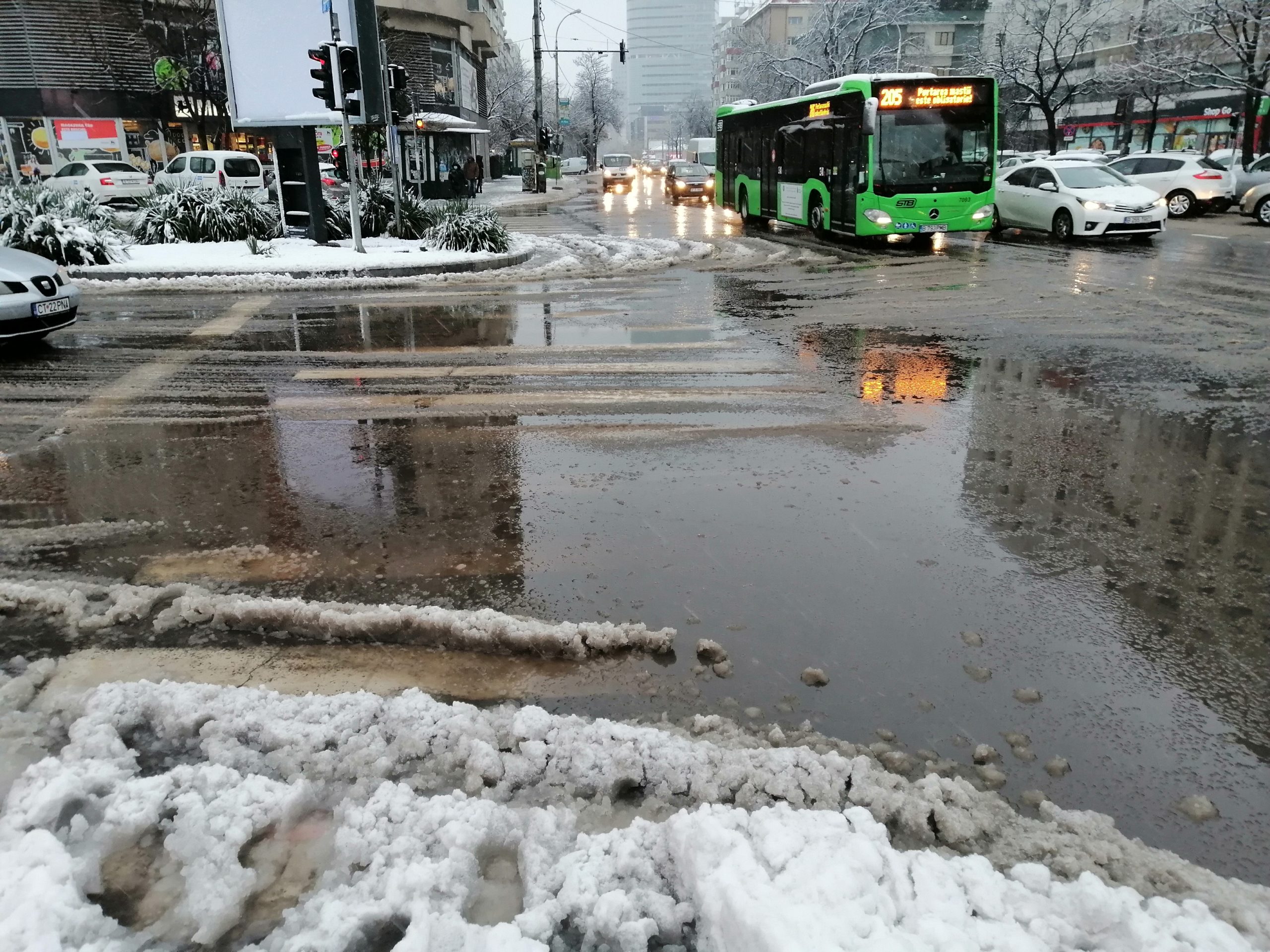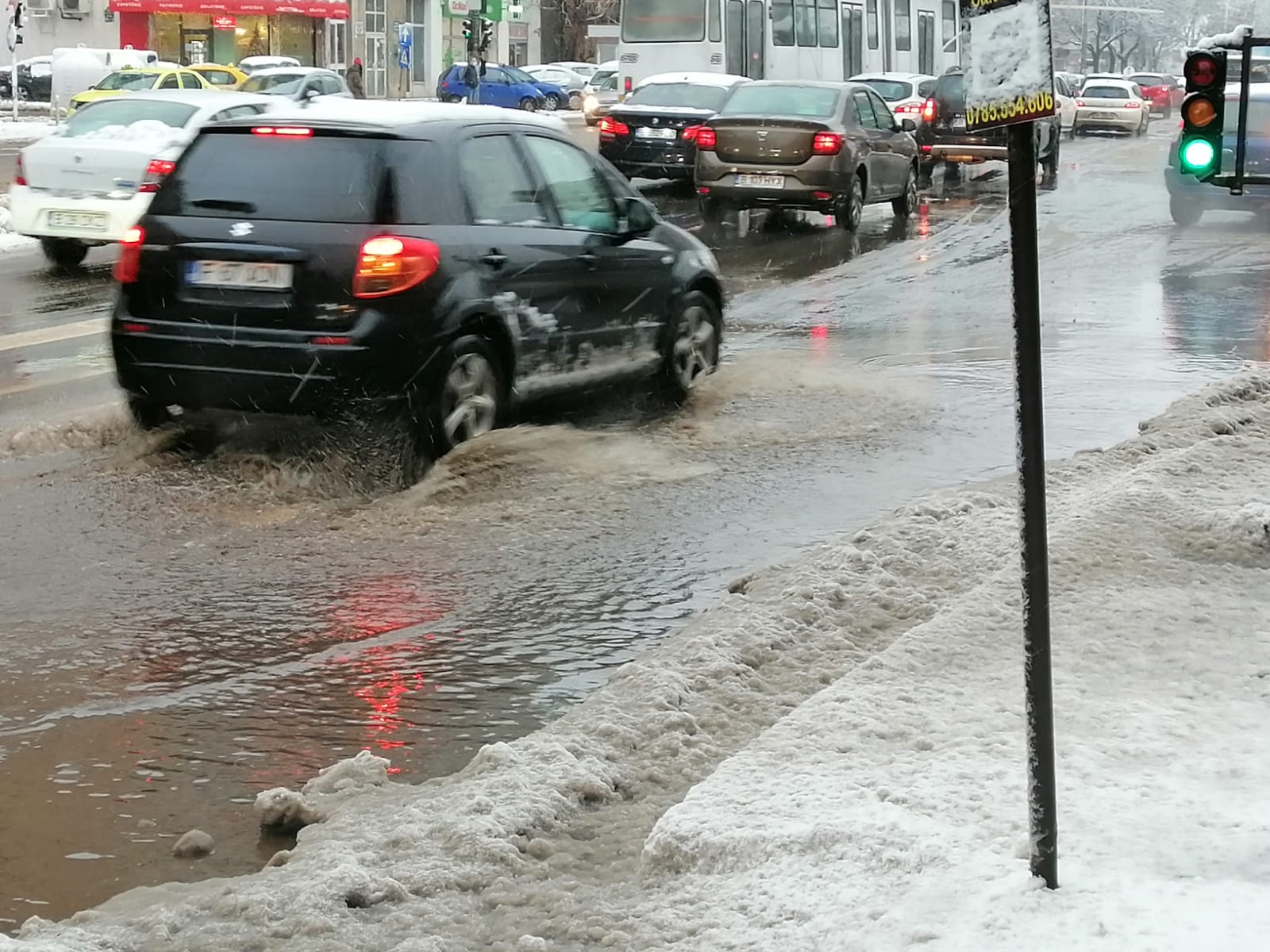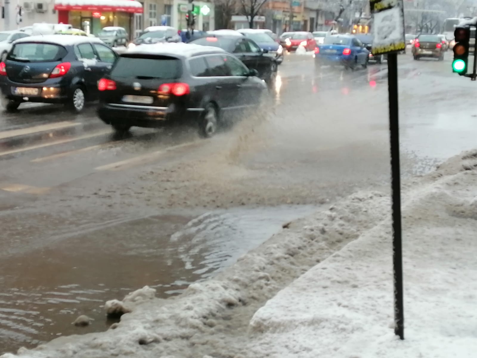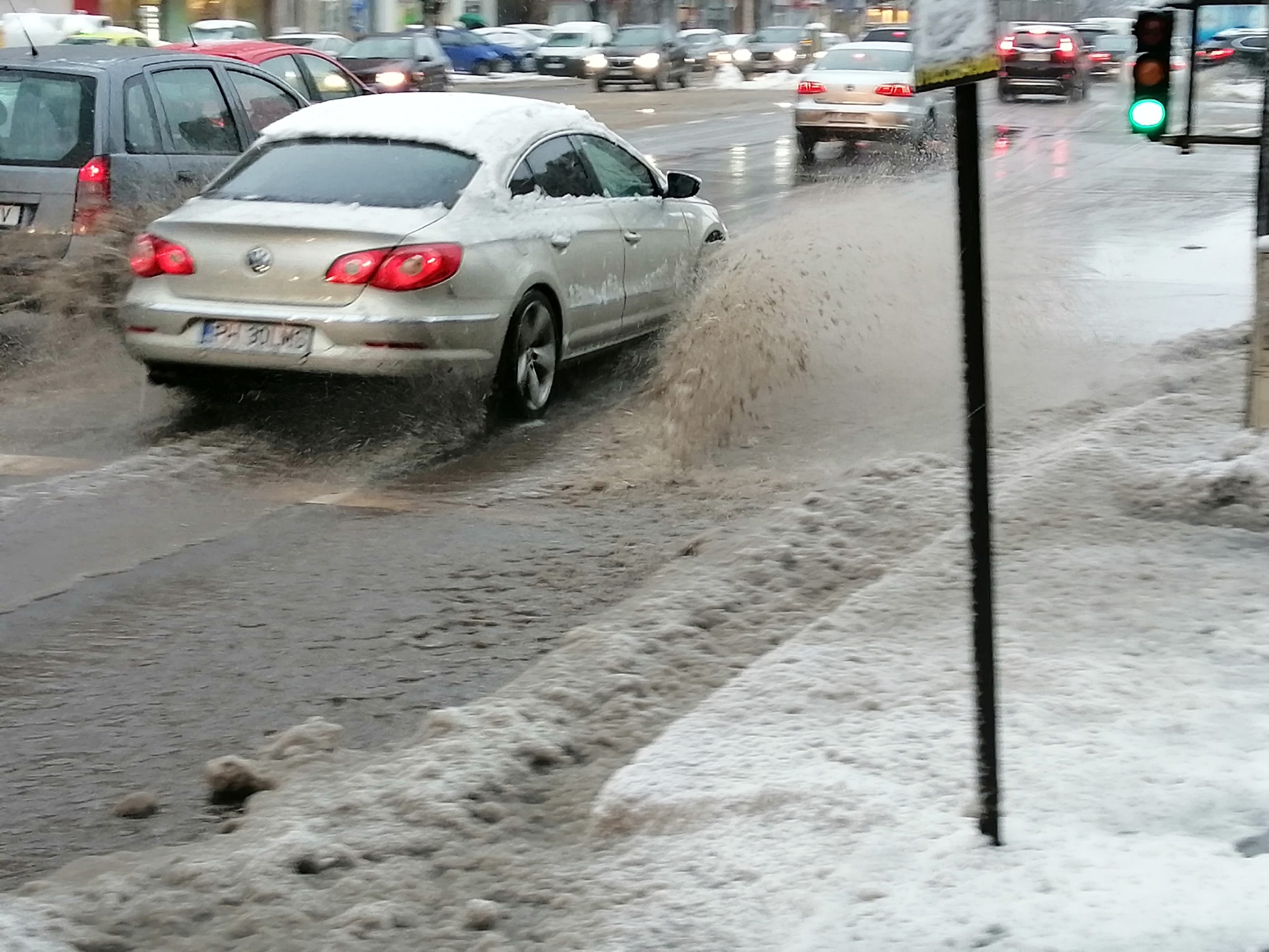 În schimb, pe trotuare și la marginea acestora s-au format acumulări mari de apă. Multe dintre ele sunt adevărate lacuri glaciare, la suprafața cărora plutește zăpadă murdară și în care te scufunzi până deasupra gleznelor. Când trec mașinile pe banda întâi împroașcă apa murdară a “lacurilor glaciare” asupra pietonilor care așteaptă culoarea verde a semaforului pentru a traversa sau mijloacele de transport în comun, în stații.