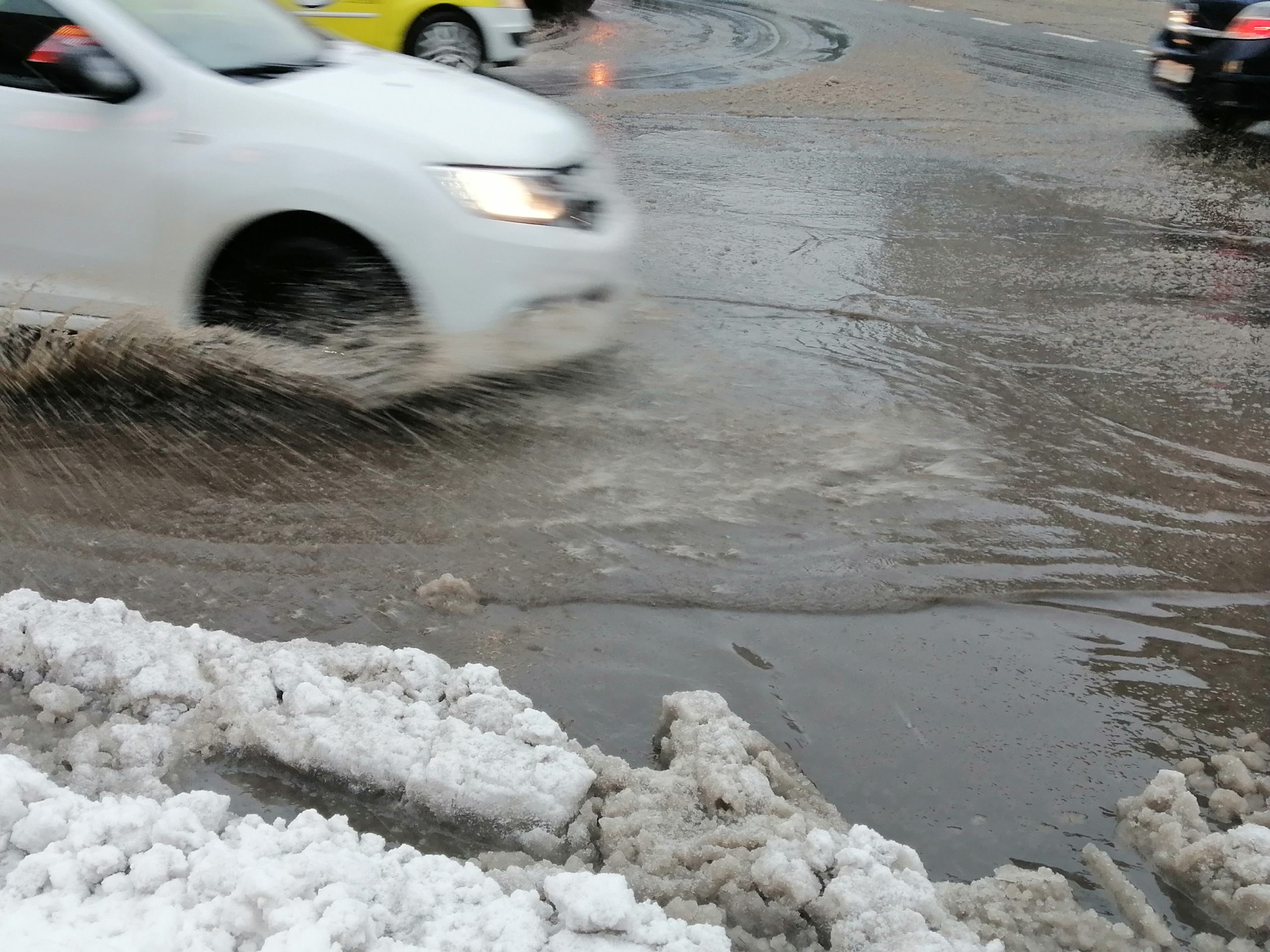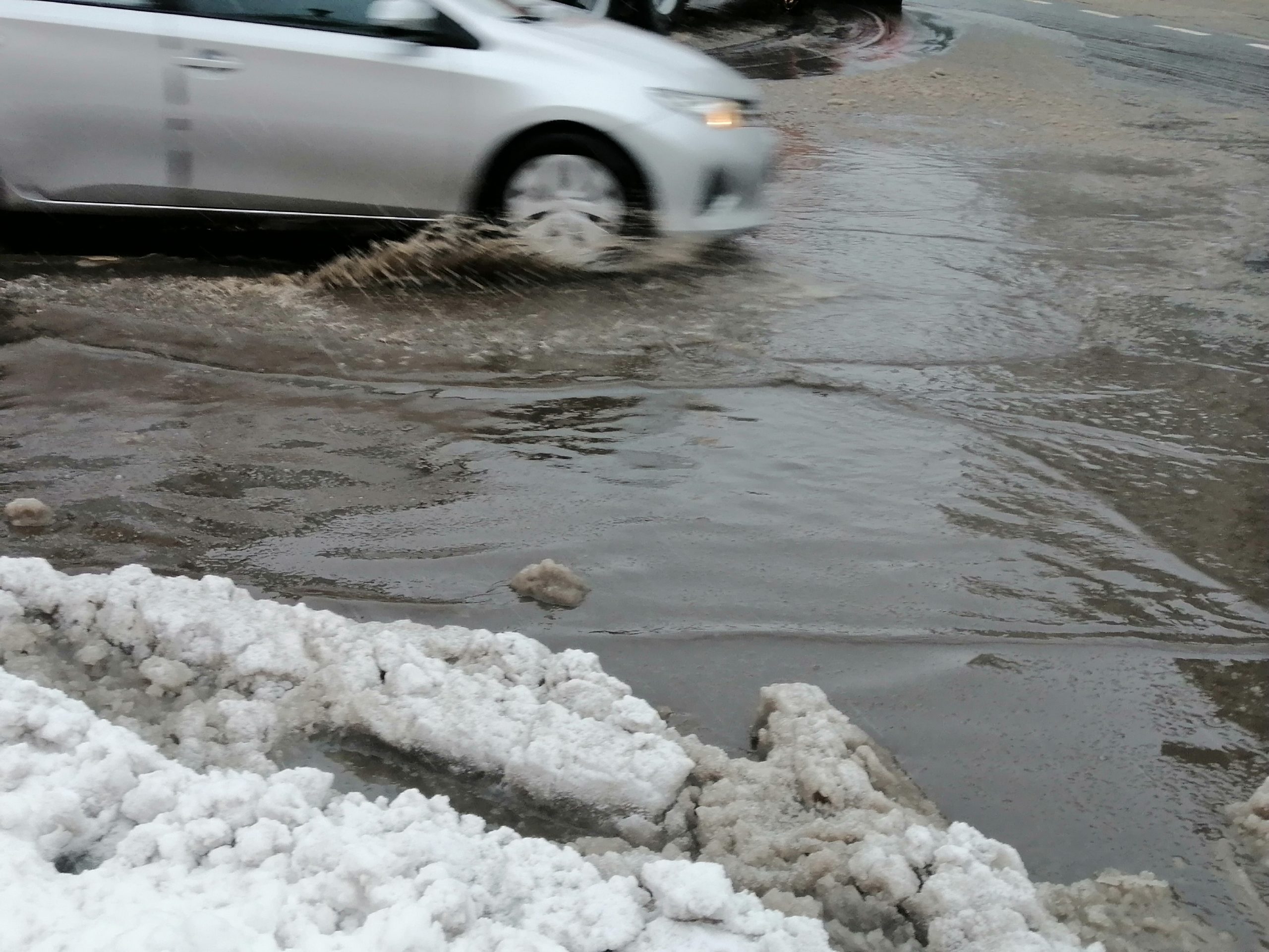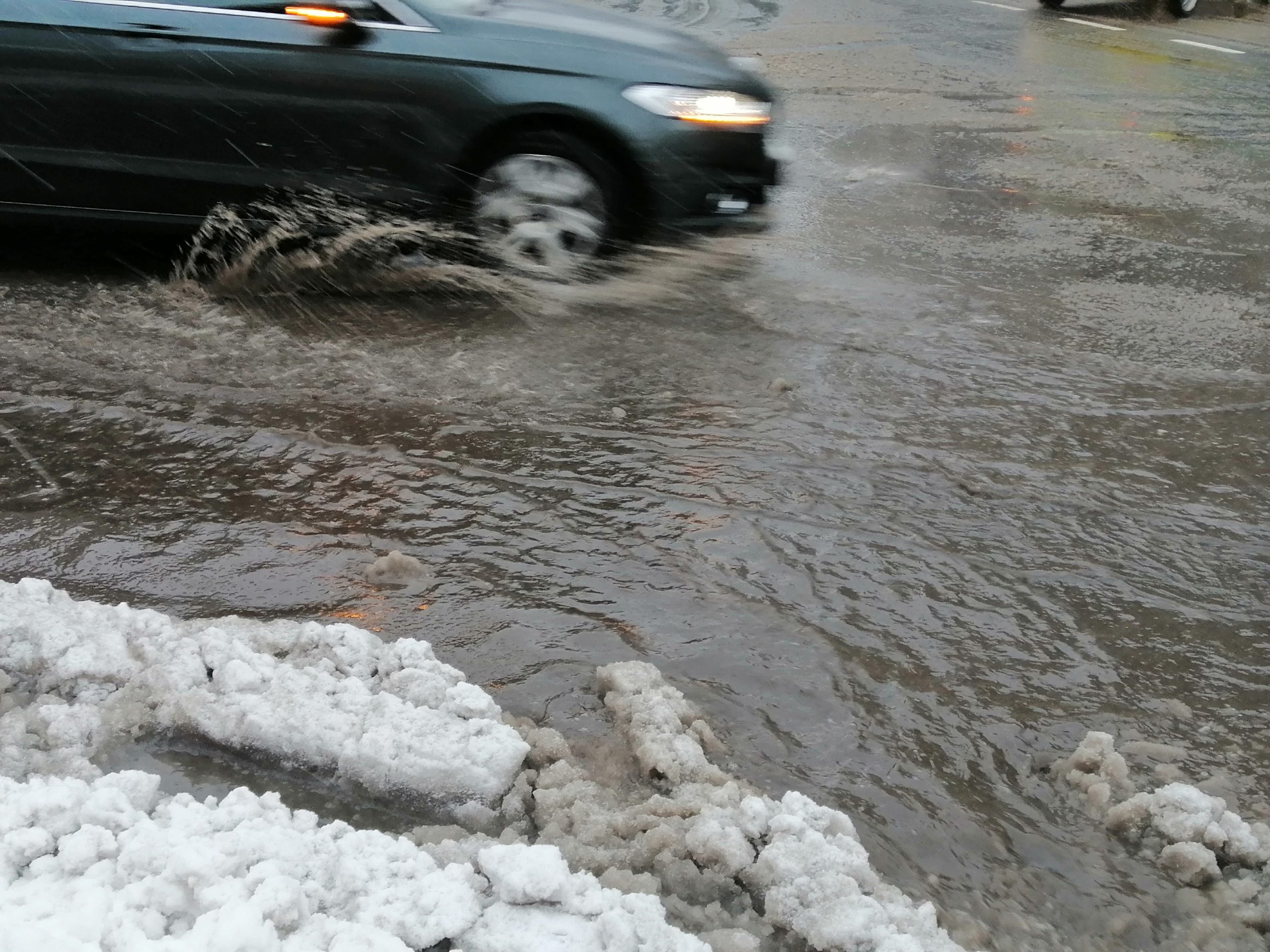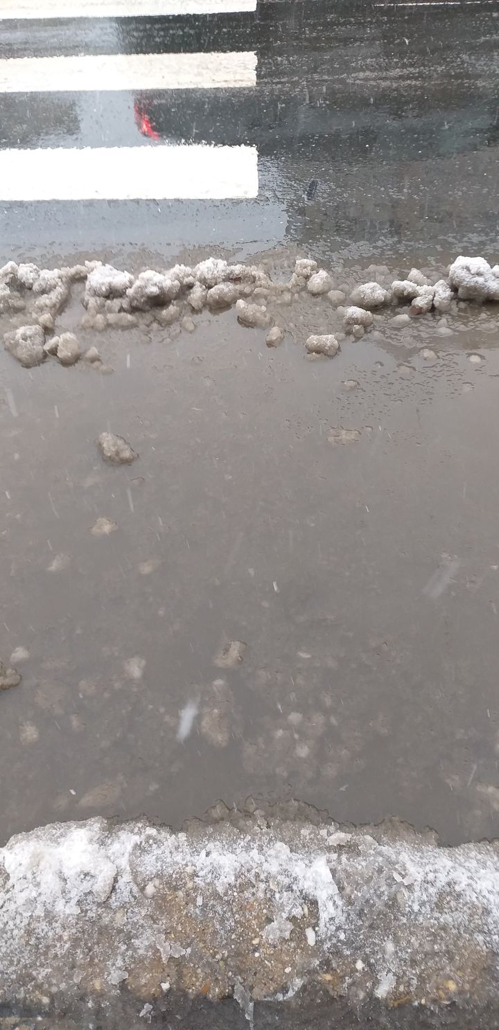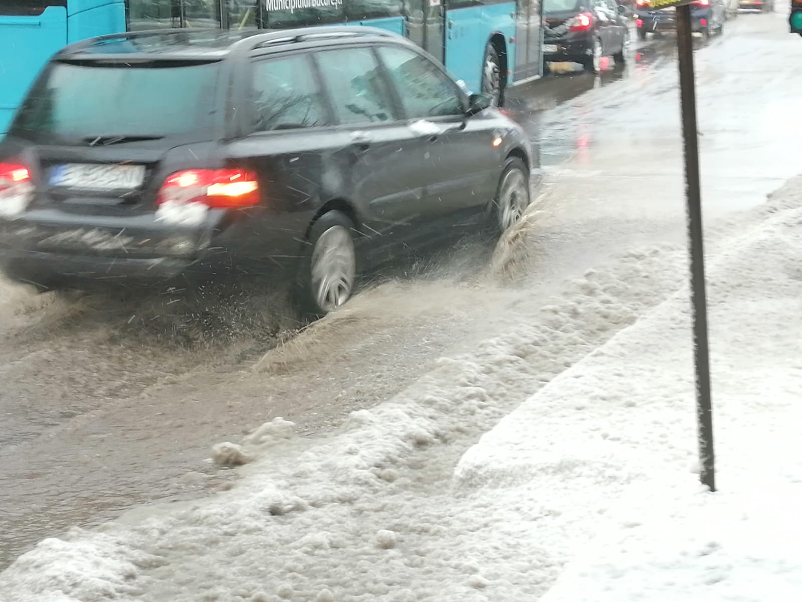 În schimb, pe trotuare și la marginea acestora s-au format acumulări mari de apă. Multe dintre ele sunt adevărate lacuri glaciare, la suprafața cărora plutește zăpadă murdară și în care te scufunzi până deasupra gleznelor. Când trec mașinile pe banda întâi împroașcă apa murdară a “lacurilor glaciare” asupra pietonilor care așteaptă culoarea verde a semaforului pentru a traversa sau mijloacele de transport în comun, în stații.