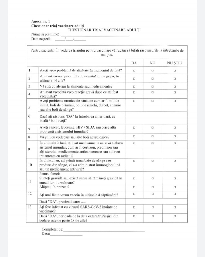 Pentru cei interesati, mai jos aveti chestionarul de triaj, folosit inainte de vaccinare.
