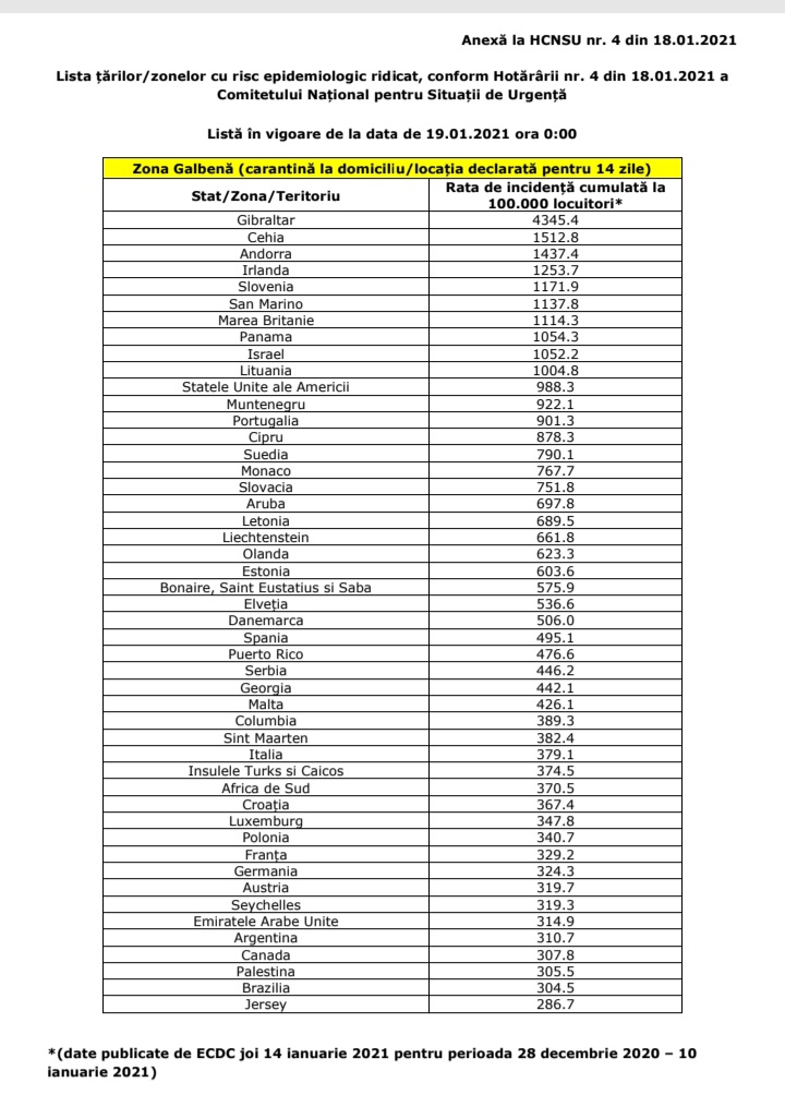 – Aprobarea listei țărilor/zonelor/teritoriilor de risc epidemiologic pentru care se instituie măsura carantinei asupra persoanelor care sosesc în România, listă valabilă începând cu data 19.01.2021, ora 0:00.