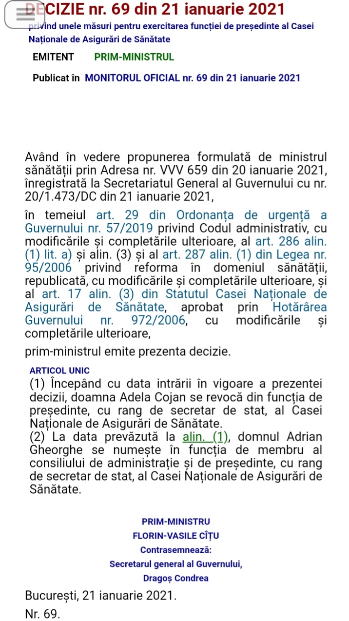 Premierul Florin Cîțu a semnat, joi, decizia prin care președintele CNAS, Adela Cojan, a fost revocată din funcție, iar la conducerea instituției a fost numit Adrian Gheorghe.