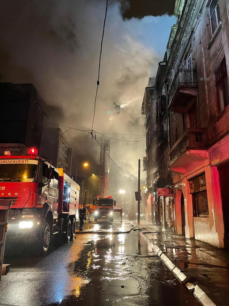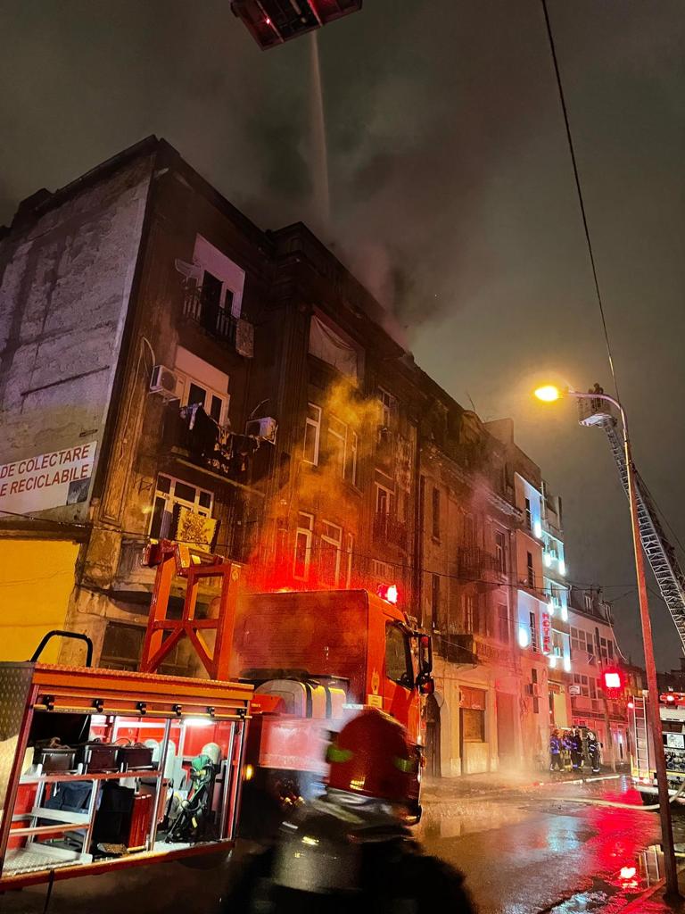 Pompierii acționează cu 11 autospeciale de stingere, două autoscări, detașamentul special de salvatori, echipaje SMURD și de descarcerare.