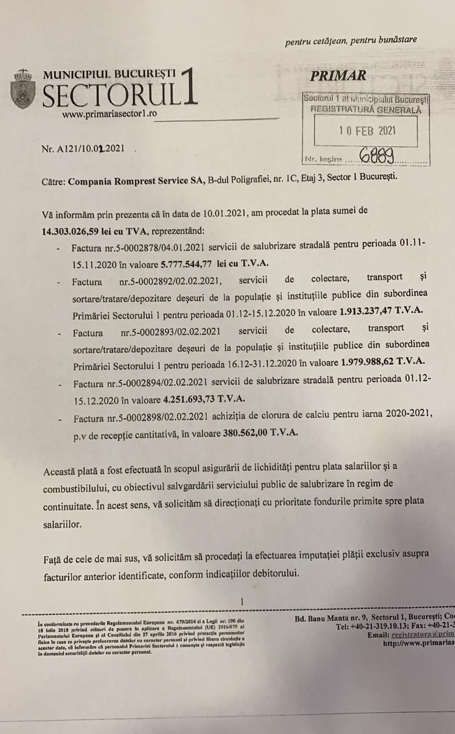 “Această plată a fost efectuată în scopul asigurării de lichidități pentru plata salariilor și a combustibilului”, se spune în adresa Primăriei Sectorului 1 către Romprest.