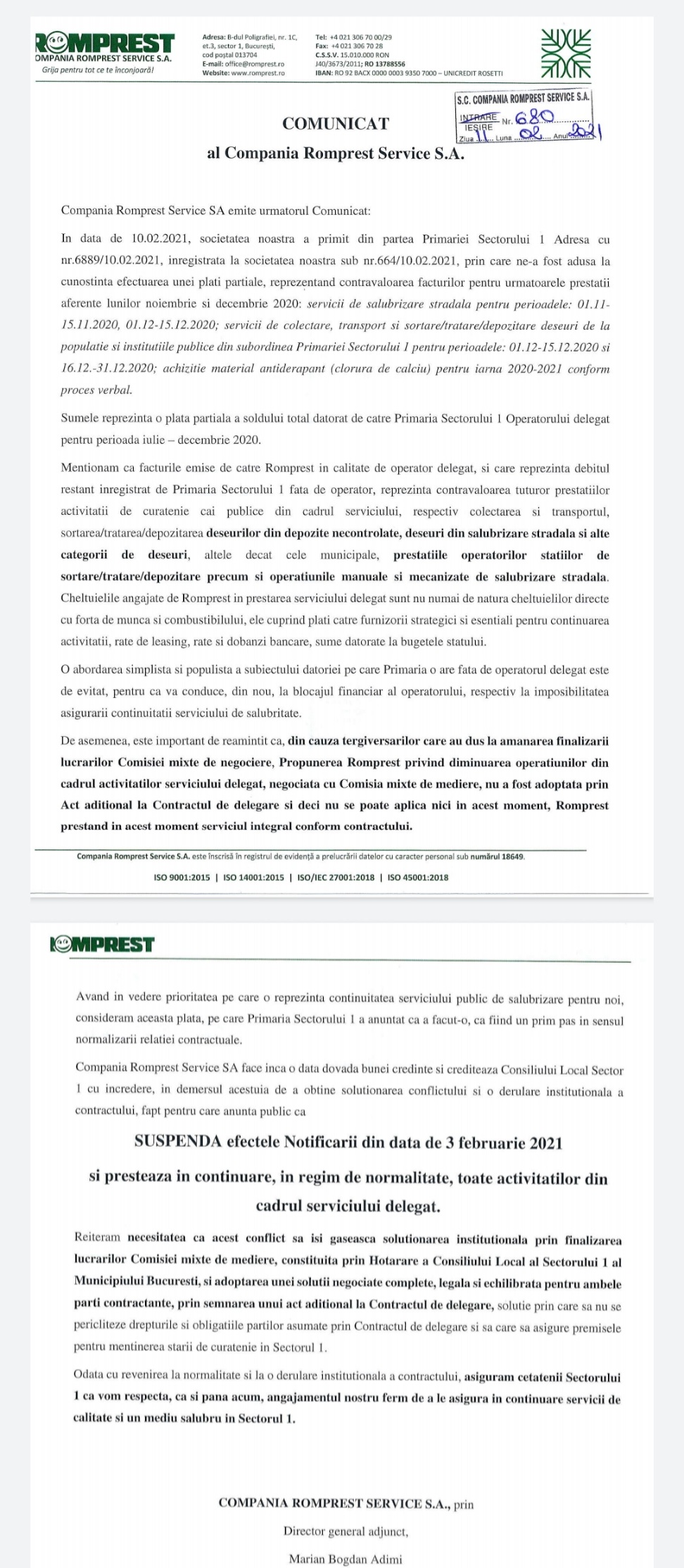 Compania Romprest Service SA face inca o data dovada bunei credinte si crediteaza Consiliului Local Sector 1 cu incredere, in demersul acestuia de a obtine solutionarea conflictului spre o derulare institutionala a contractului, fapt pentru care anunta public ca SUSPENDA efectele Notificarii din data de 3 februarie 2021 si presteaza in continuare, in regim de normalitate, toate activitatile din cadrul serviciului delegat.”