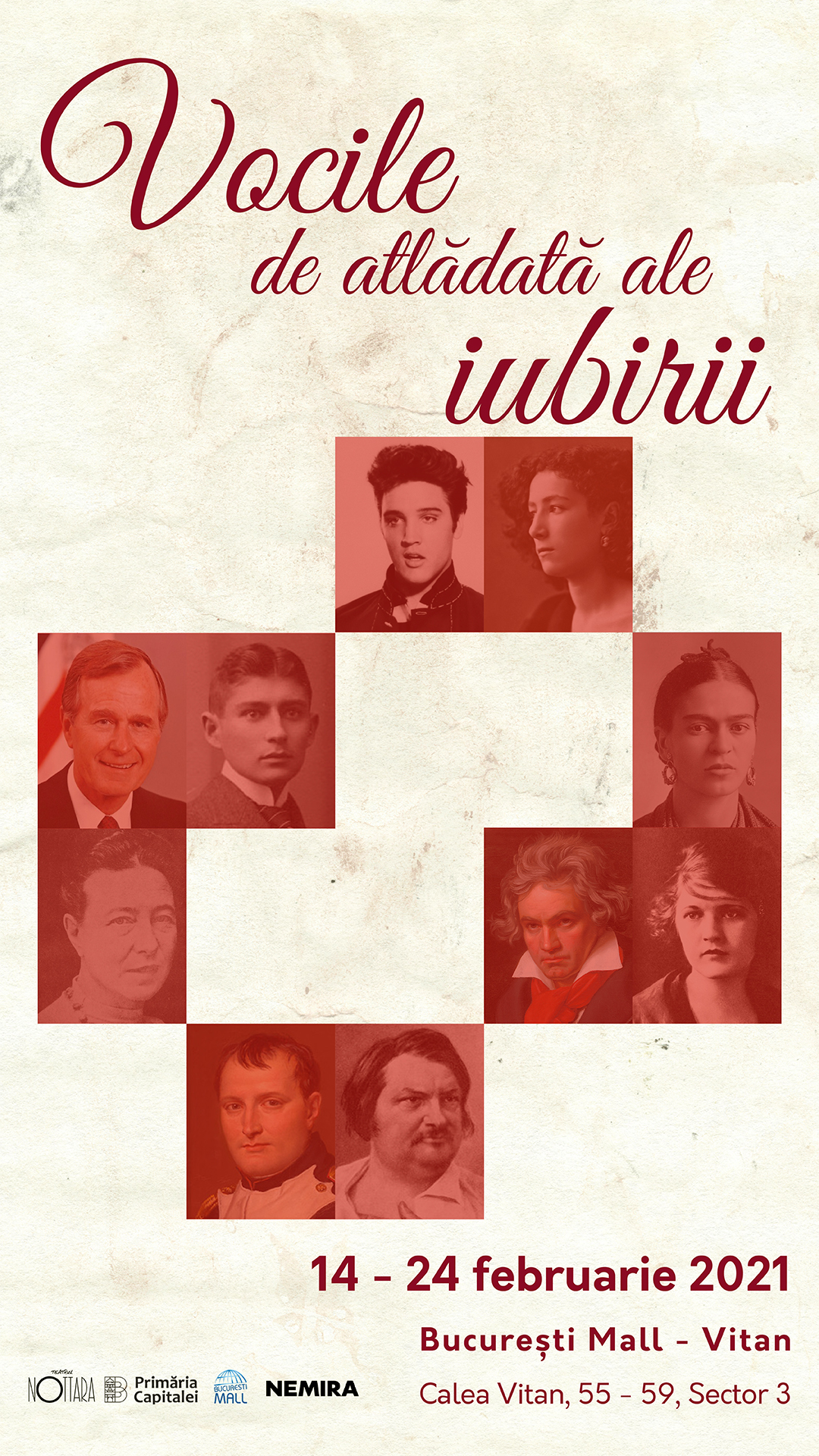 Expoziția Vocile de altădată ale iubirii, realizată în parteneriat cu Teatrul Nottara și cu editura Nemira, prezintă 10 dintre textele publicate de editură în volumul „50 cele mai frumoase scrisori de dragoste”, variind de la corespondența dintre Ludwig van Beethoven – „Eterna iubită“, Frida Kahlo – Diego Rivera până la Marjorie Fossa – Elvis Presley și George Bush – Barbara Pierce.