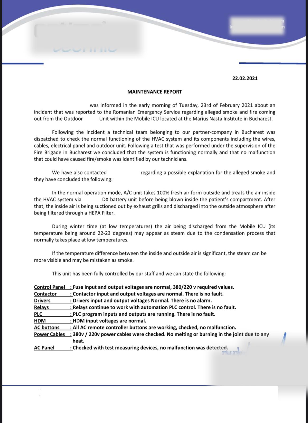 Conform acestui raport, înaintat de firma care asigură mentenanța către producătorul unităților de terapie intensivă mobilă, se arată că instalația electrică și celelalte componente ale sistemului de climatizare nu prezintă urme de incendiu și nu au fost evidențiate probleme tehnice, sistemul funcționând în condiții optime, aceste aspecte sustinând afirmația conform căreia incidentul anunțat la 112 a fost o alarmă falsă.