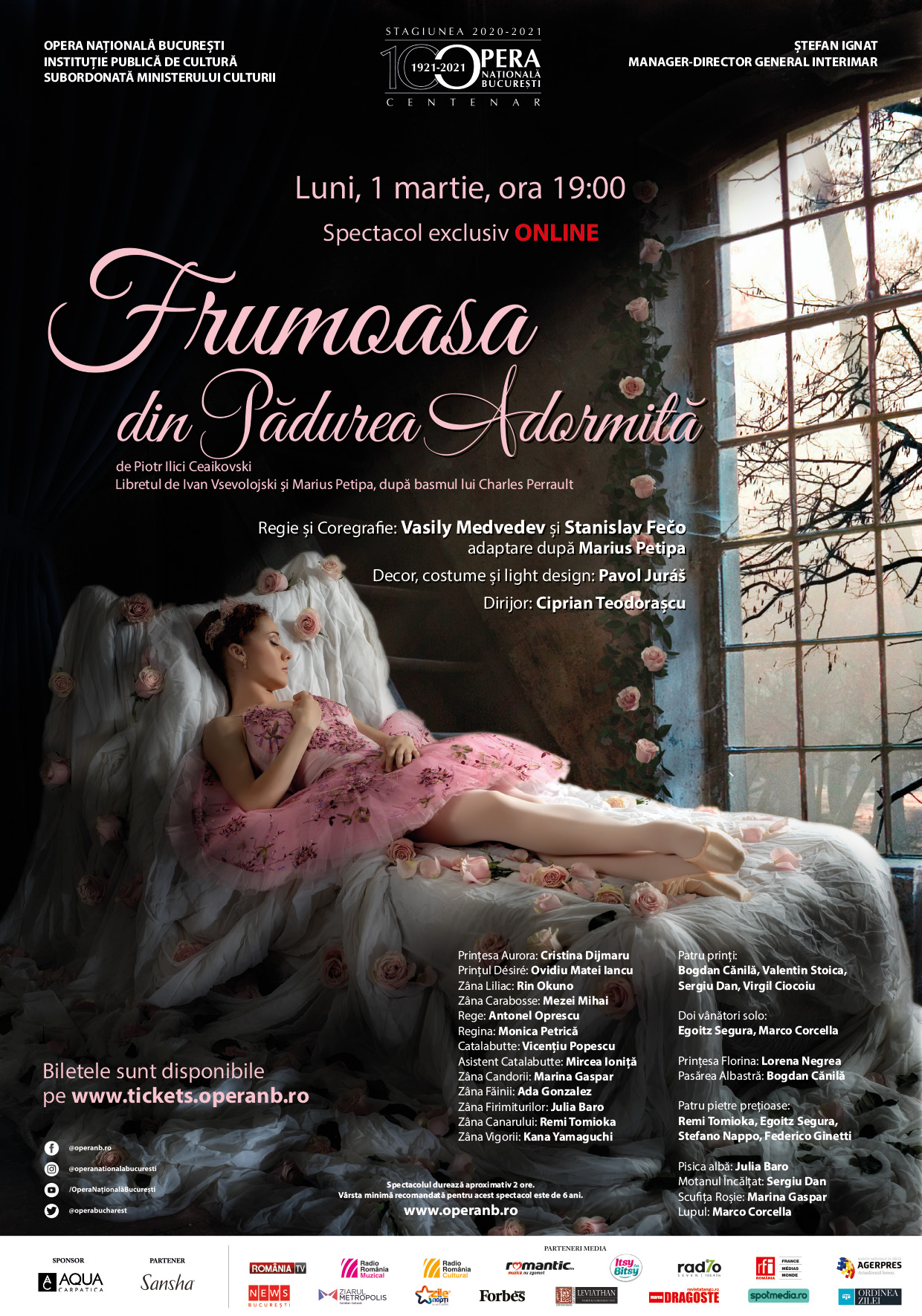 Opera Națională București transmite online spectacolul de balet „Frumoasa din Pădurea Adormită” de Piotr Ilici Ceaikovski, luni, 1 martie 2021, începând cu ora 19:00, cu ocazia Zilei de Mărțișor.