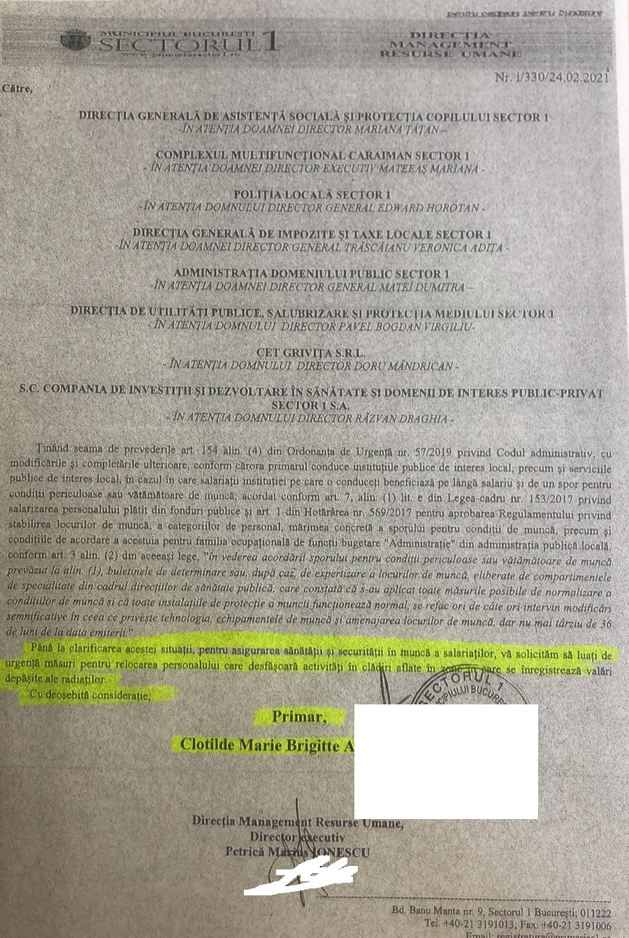 Nu în ultimul rând, clădirea în care se află sediul ADP Sector 1 este expusă radiațiilor de la antenele instalate pe acoperișul Casei Presei, așa cum atestă Buletinul de expertiză nr 161/11.12. 2017. Din cauza acestui câmp electromagnetic, angajații ADP Sector 1 primesc și spor de expunere la radiații, se mai arată în punctul de vedere al sindicaliștilor, mai spune șeful sindicaliștilor de la Primăria Sectorului 1 .