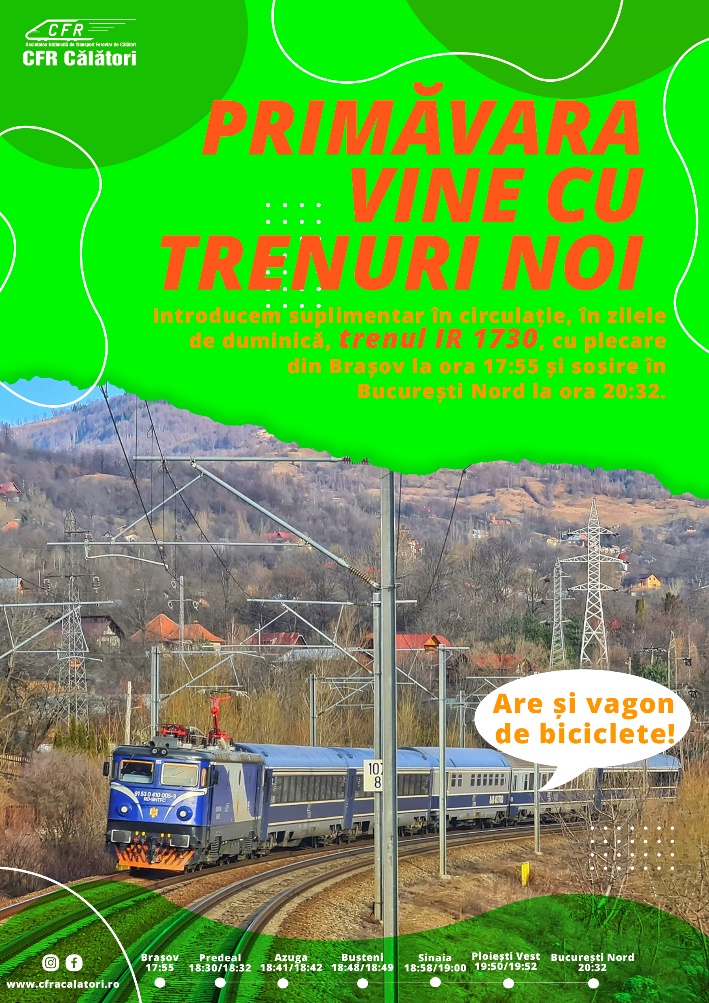 “Pentru ca turiştii să se bucure de un weekend prelungit pe Valea Prahovei, la întoarcerea spre casă am adăugat suplimentar în circulaţie, în zilele de duminică, trenul IR 1730, cu plecare din Braşov la ora 17:55 şi sosire în Bucureşti Nord la ora 20:32”, menţionează CFR Călători.