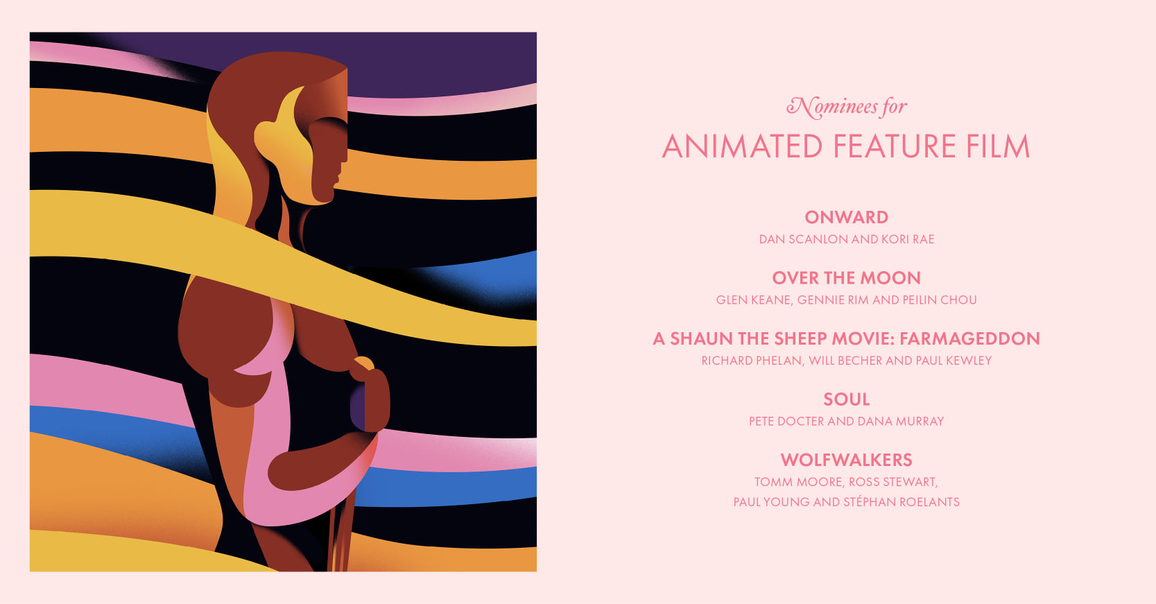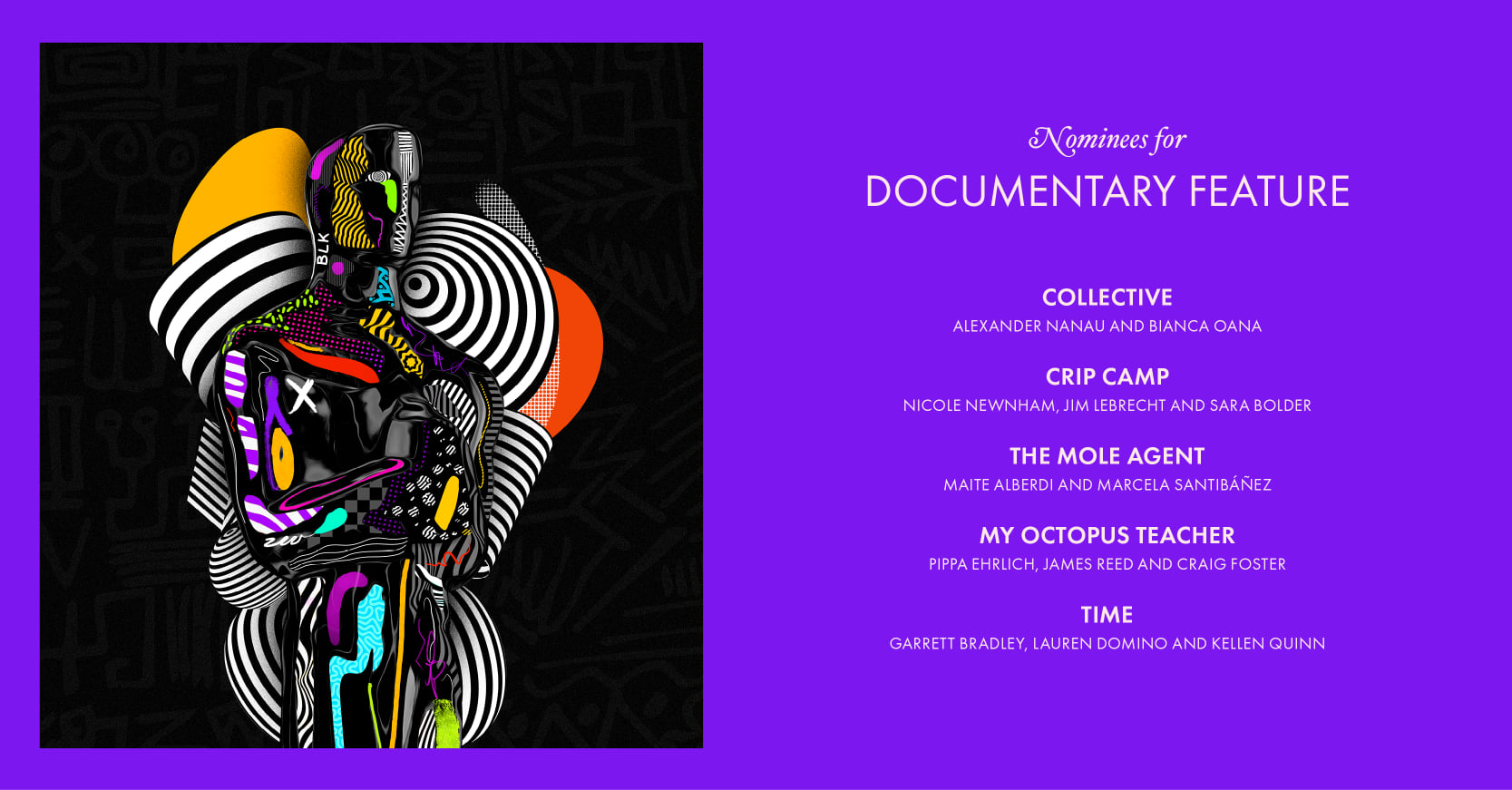 La categoria documentar, au mai fost nominalizate „Crip Camp”, „The Mole Agent”, „My Octopus Teacher” şi „Time”.