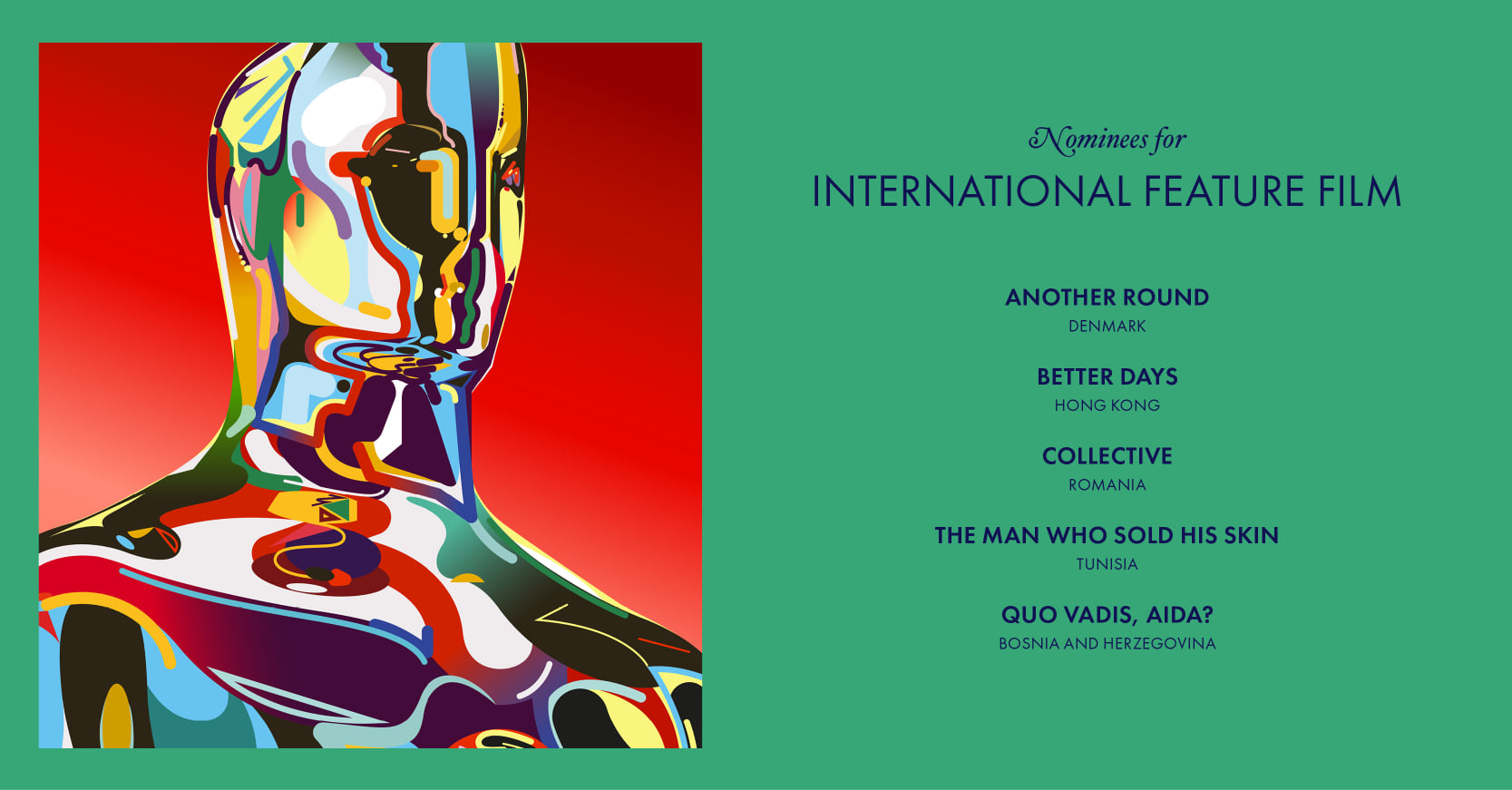 La categoria lungmetraj internaţional, „Colectiv” concurează cu „Another Round” (Danemarca), „Better Days” (Hong Kong), „The Man Who Sold His Skin” (Tunisia) şi „Quo Vadis, Aida?” (Bosnia şi Herţegovina, coproducţie cu participare românească).