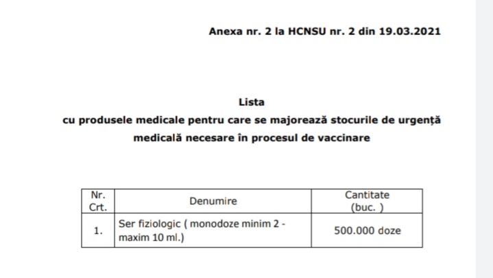 Urgență, Șef al Departamentului pentru Situații de Urgență, referitoare la majorarea cantității inițiale de ser fiziologic, ca urmare a solicitării transmise de președintele Comitetului Național de coordonare a activităților privind vaccinarea împotriva SARSCoV-2,