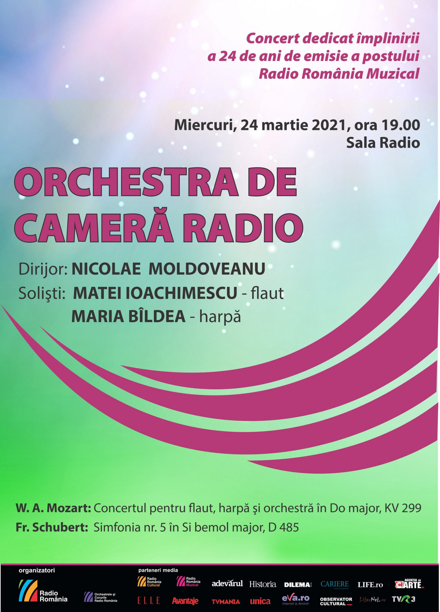 Evenimentul special organizat miercuri, 24 martie (ora 19:00), cu ocazia Zilei Radio România Muzical, propune Concertul pentru flaut, harpă și orchestră, o alăturare sonoră deosebită sub semnătura genialului W.A. Mozart, care adună trei apreciați muzicieni români: dirijorul Nicolae Moldoveanu, flautistul Matei Ioachimescu și harpista Maria Bîldea, alături de Orchestra de Cameră Radio. Programul serii include și Simfonia nr. 5 de Franz Schubert, întregind astfel o superbă incursiune în clasicismul muzical vienez.