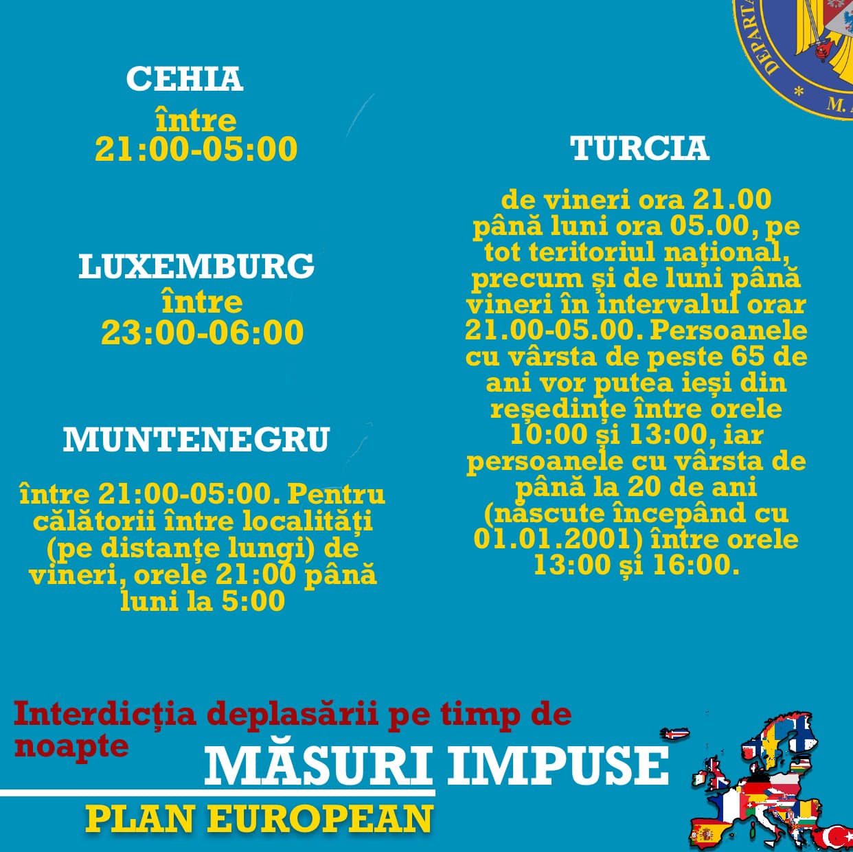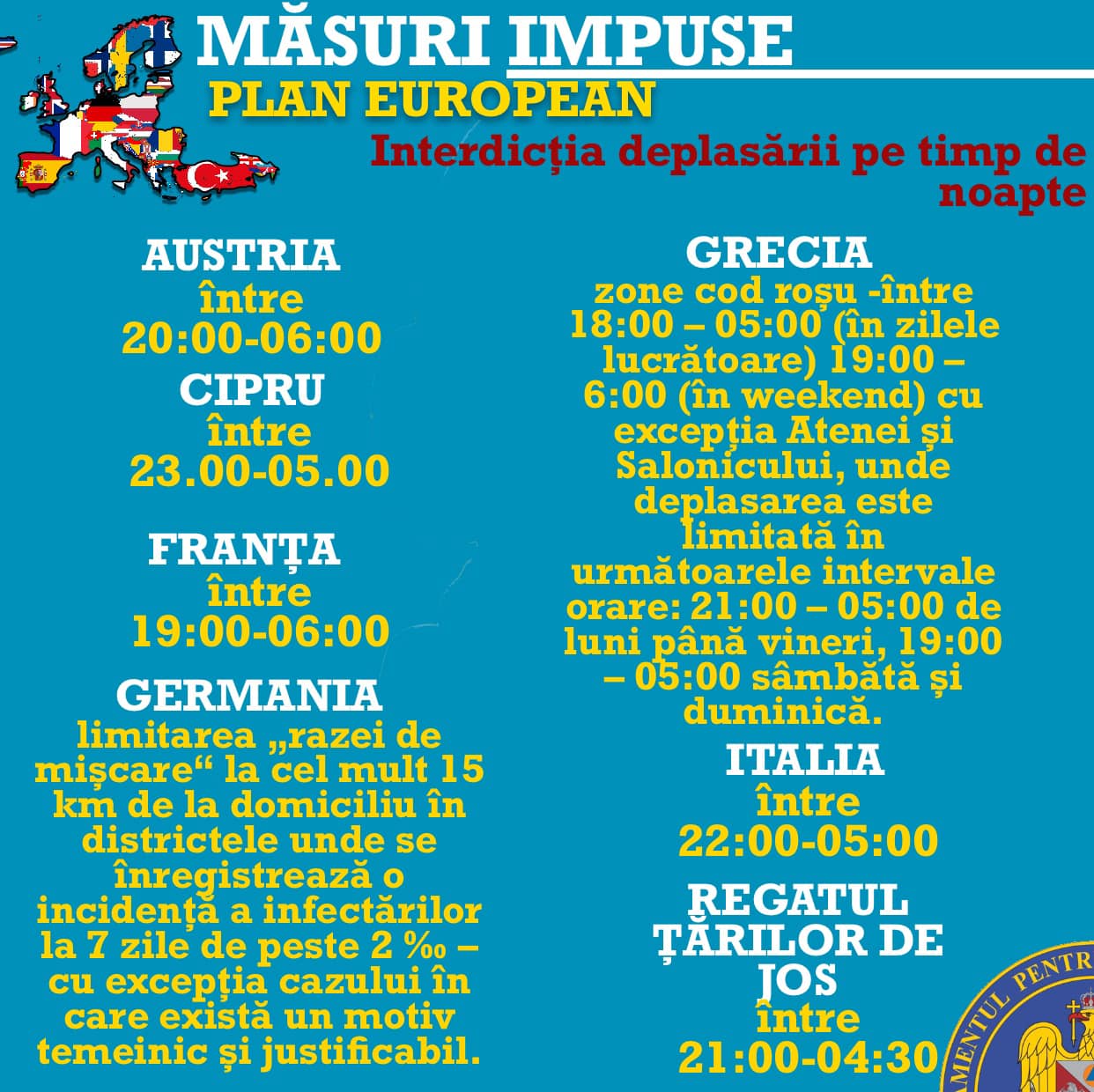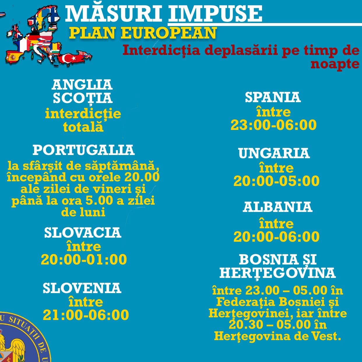 Departamentul pentru Situaţii de Urgenţă prezinta o parte dintre restricțiile luate de mai multe state europene de reducere a mobilității intre anumite intervale orare, cu scopul de a limita răspândirea coronavirusului SARS-CoV-2 și a gestiona eficient criza sanitară actuală.