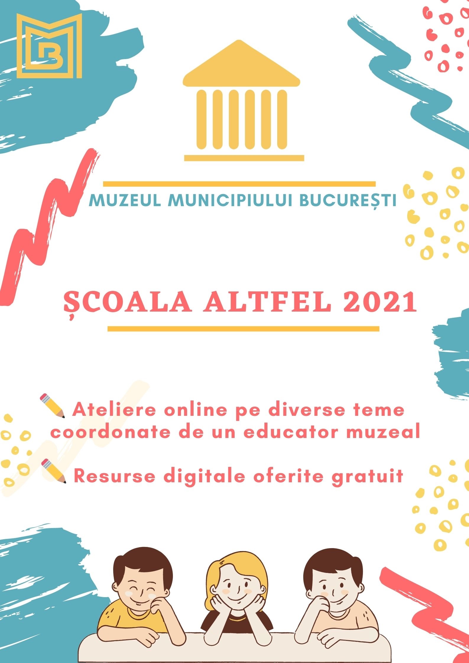 Muzeul Municipiului București și-a adaptat programul educațional destinat elevilor și cadrelor didactice pentru Școala Altfel și oferă în anul 2021 mai multe tipuri de resurse digitale gratuite la care toți cei interesați sunt invitați să apeleze cu încredere pentru buna desfășurare a activităților extrașcolare, precum și o serie de ateliere online cu o tematică diversificată susținute în parteneriat cu Asociația Learning by Teaching, Artelier D și îndrăgitul autor de benzi desenate Mihai I. Grăjdeanu.