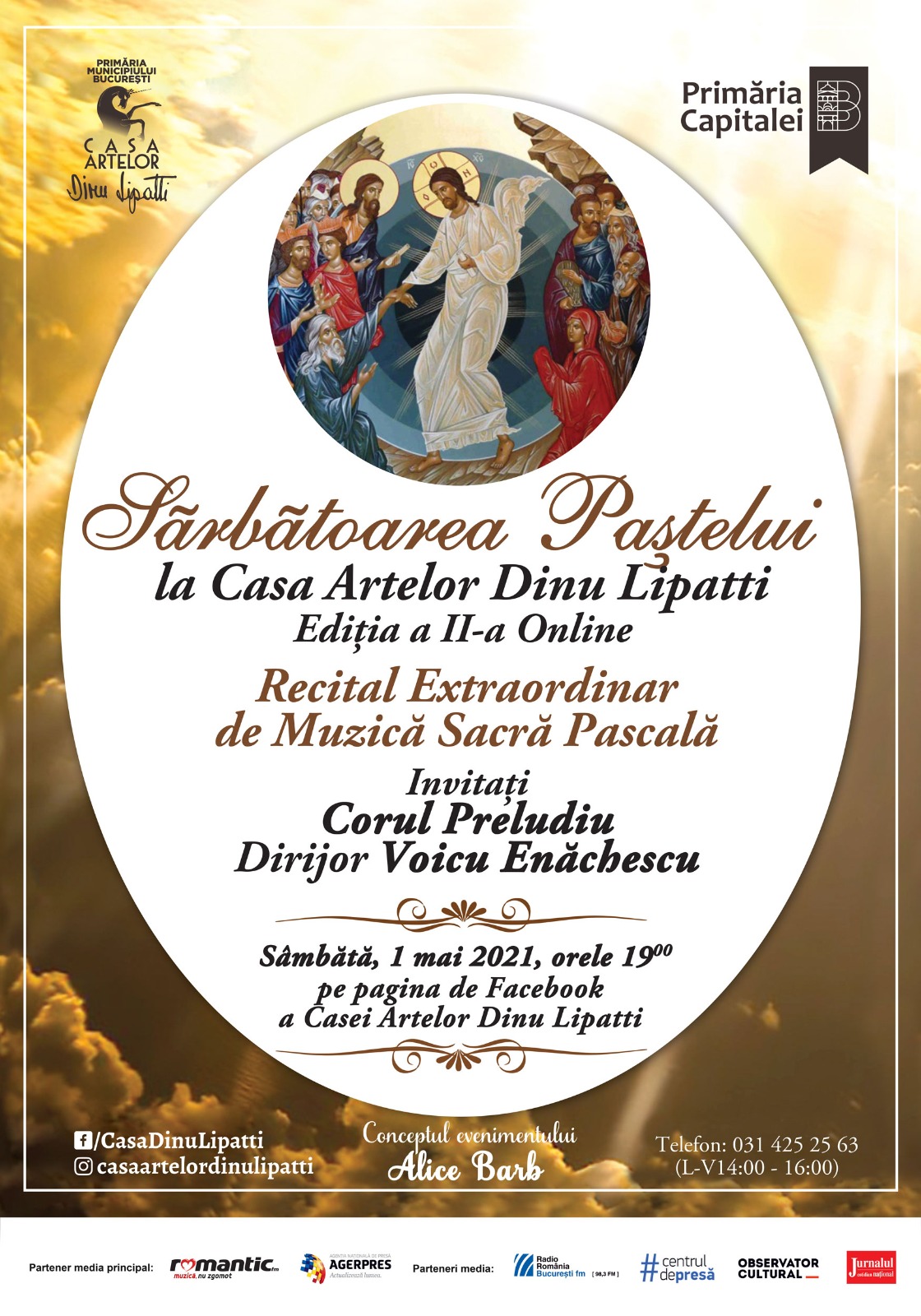 Casa Artelor Dinu Lipatti vă invită să celebrați împreună Sărbătoarea Paștelui, Ediția a II-a, urmărind în Premieră Online Recitalul Extraordinar de muzică sacră pascală susţinut de Corul Preludiu, sub bagheta dirijorului Voicu Enăchescu, sâmbătă, 1 mai 2021, de la orele 19:00, pe pagina de Facebook a instituției.