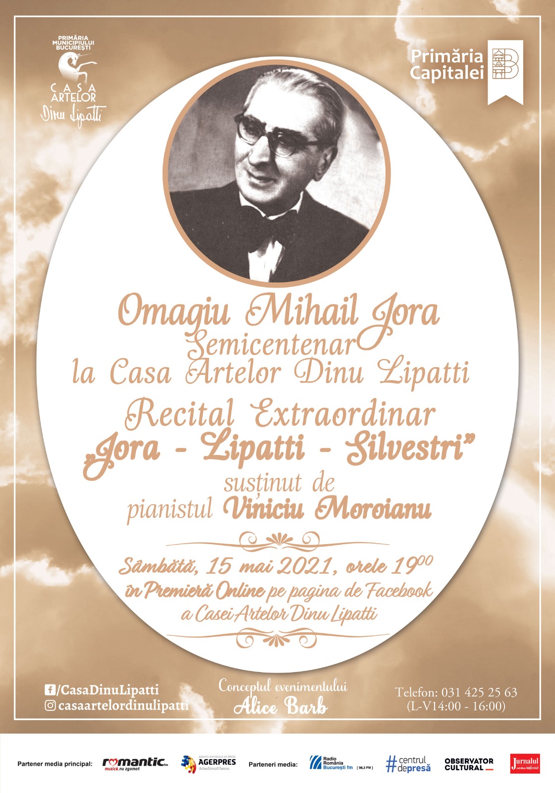 Astfel sâmbătă, 15 mai 2021, de la orele 19:00, puteți să urmăriți Recitalul Extraordinar „Jora – Lipatti – Silvestri” susținut de pianistul Viniciu Moroianu, un Recital al dialogului dintre generații, dintre Maestul Mihail Jora și discipolii săi, Dinu Lipatti și Constantin Silvestri, în program fiind incluse lucrări semnate de cei trei compozitori.