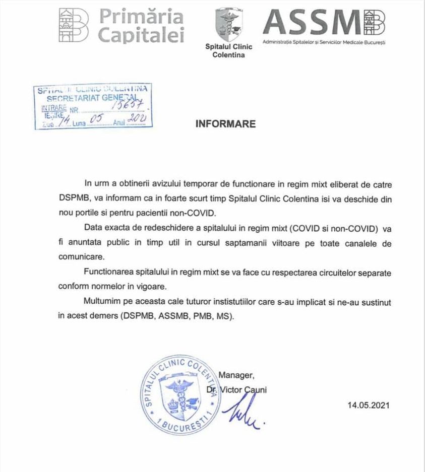 “În urma obţinerii avizului temporar de funcţionare în regim mixt eliberat de către DSPMB, vă informăm că în foarte scurt timp Spitalul Clinic Colentina îşi va deschide din nou porţile şi pentru pacienţii non-COVID.