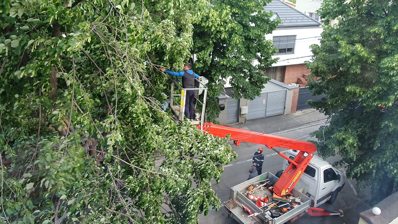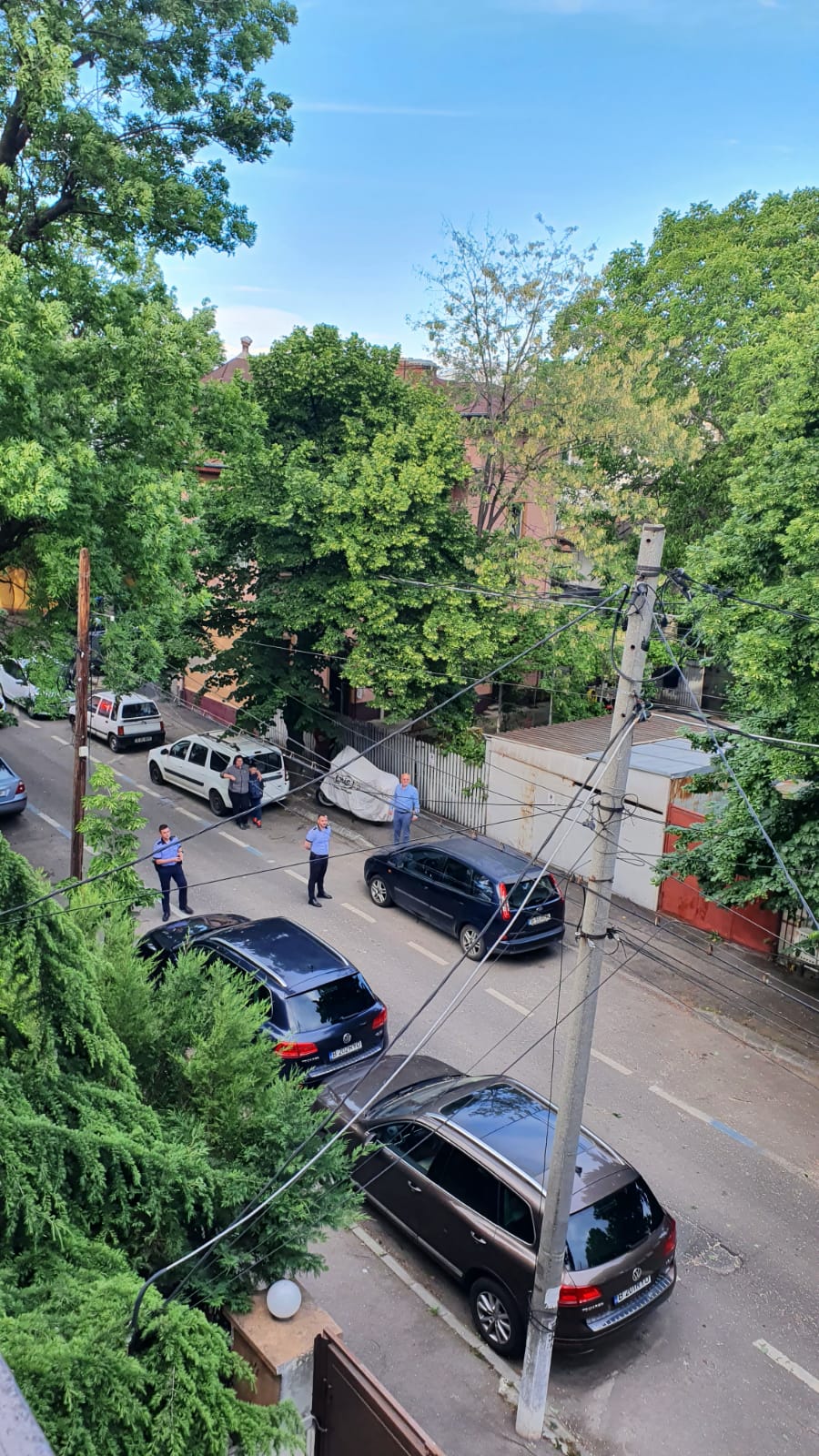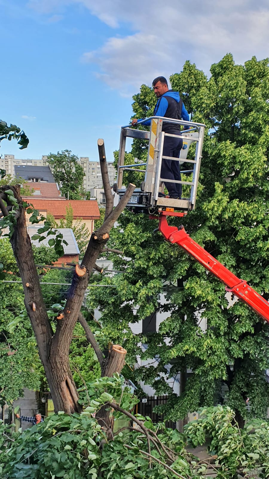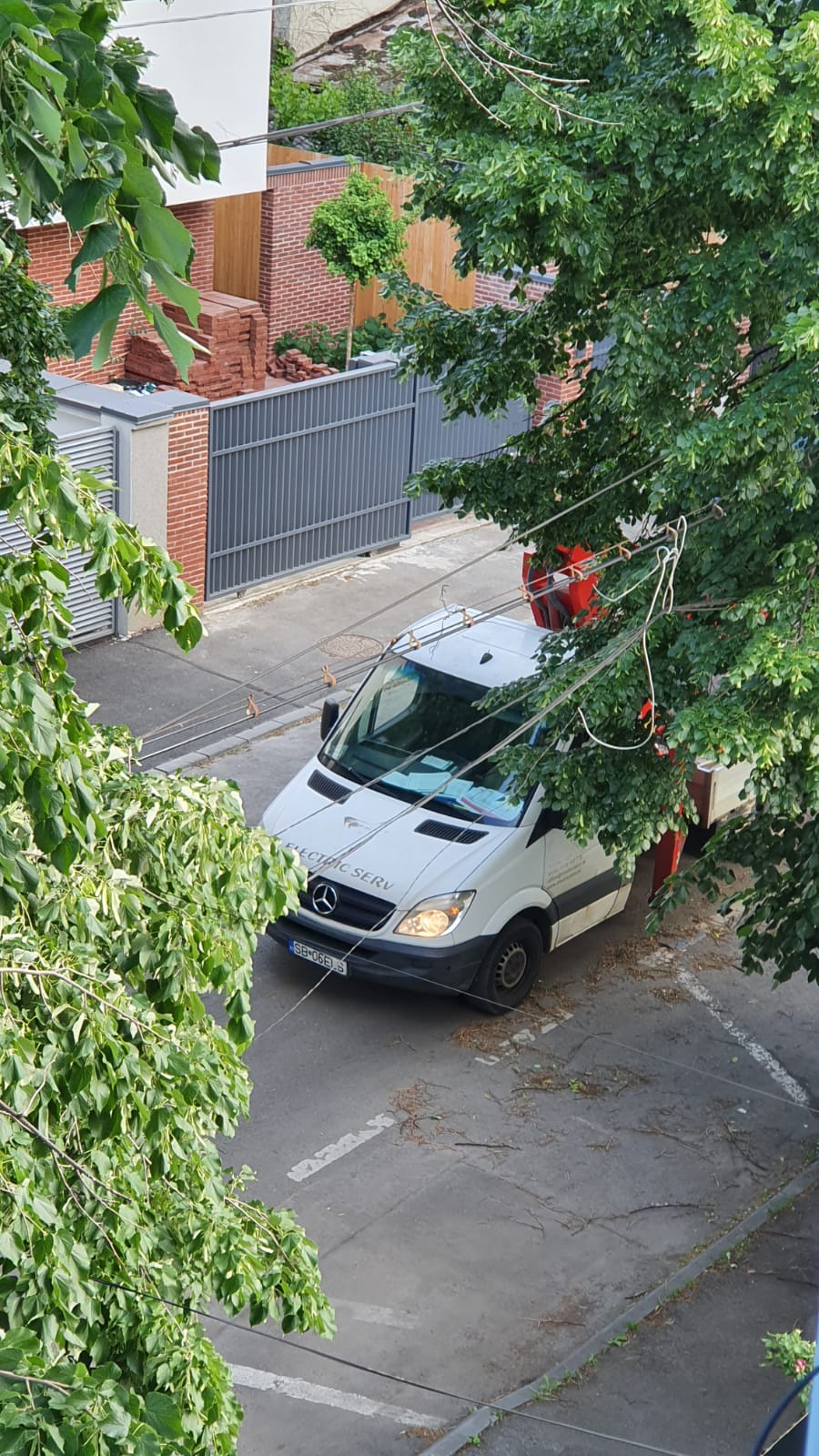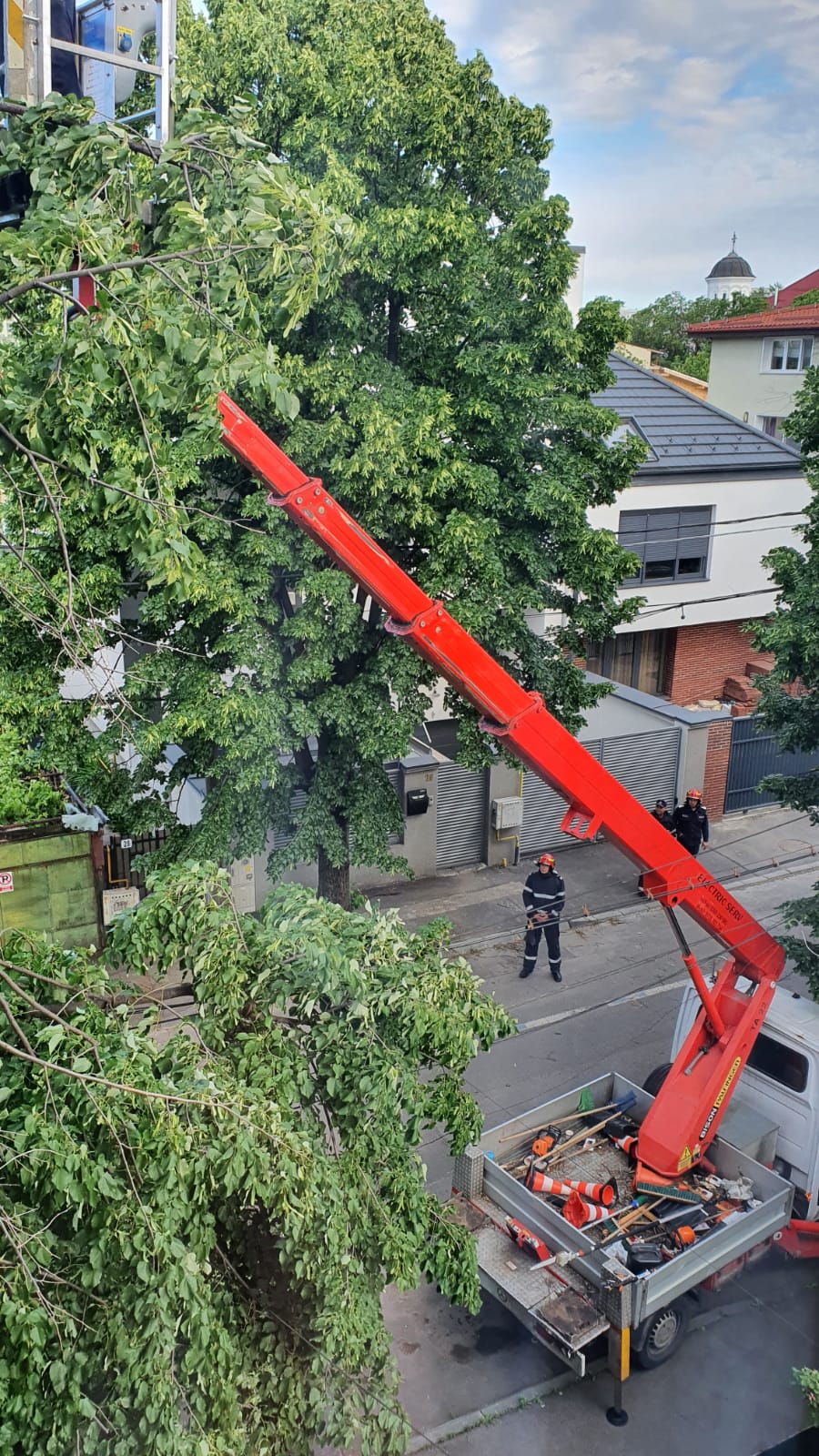 Am urmărit operațiunile, de la restricționarea circulației pe stradă, cu ajutorul mașinilor poliției, sosirea mașinii de pompieri și până la tăierea propriu zisă a copacului ce amenință să se prăbușească peste case, mașini, trecători, rețeaua stradala de cabluri electrice, iluminat public și telecomunicații.