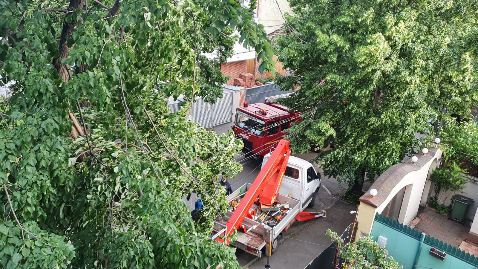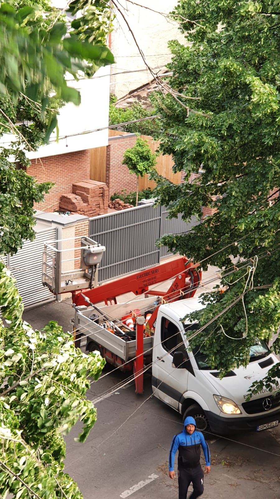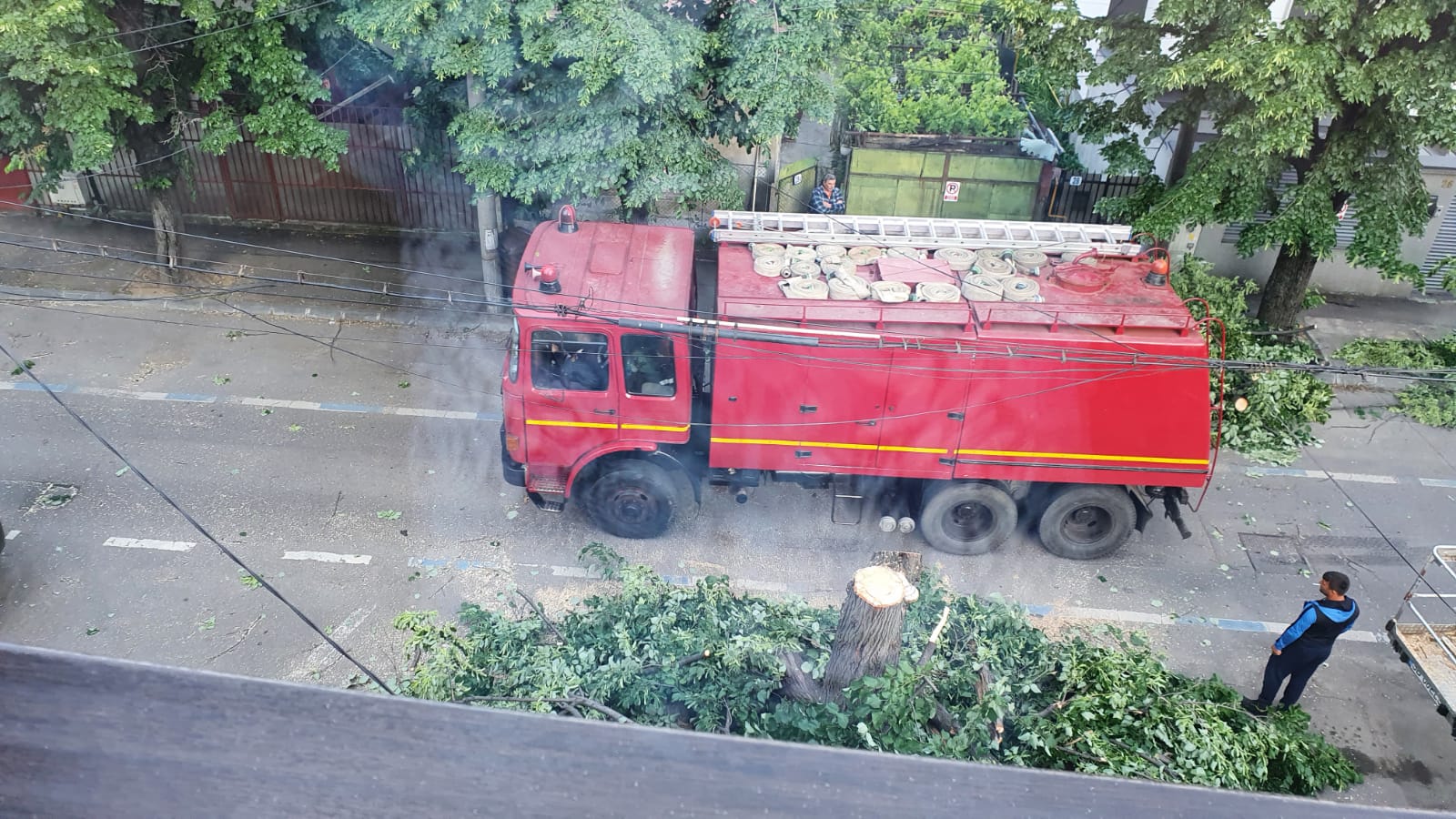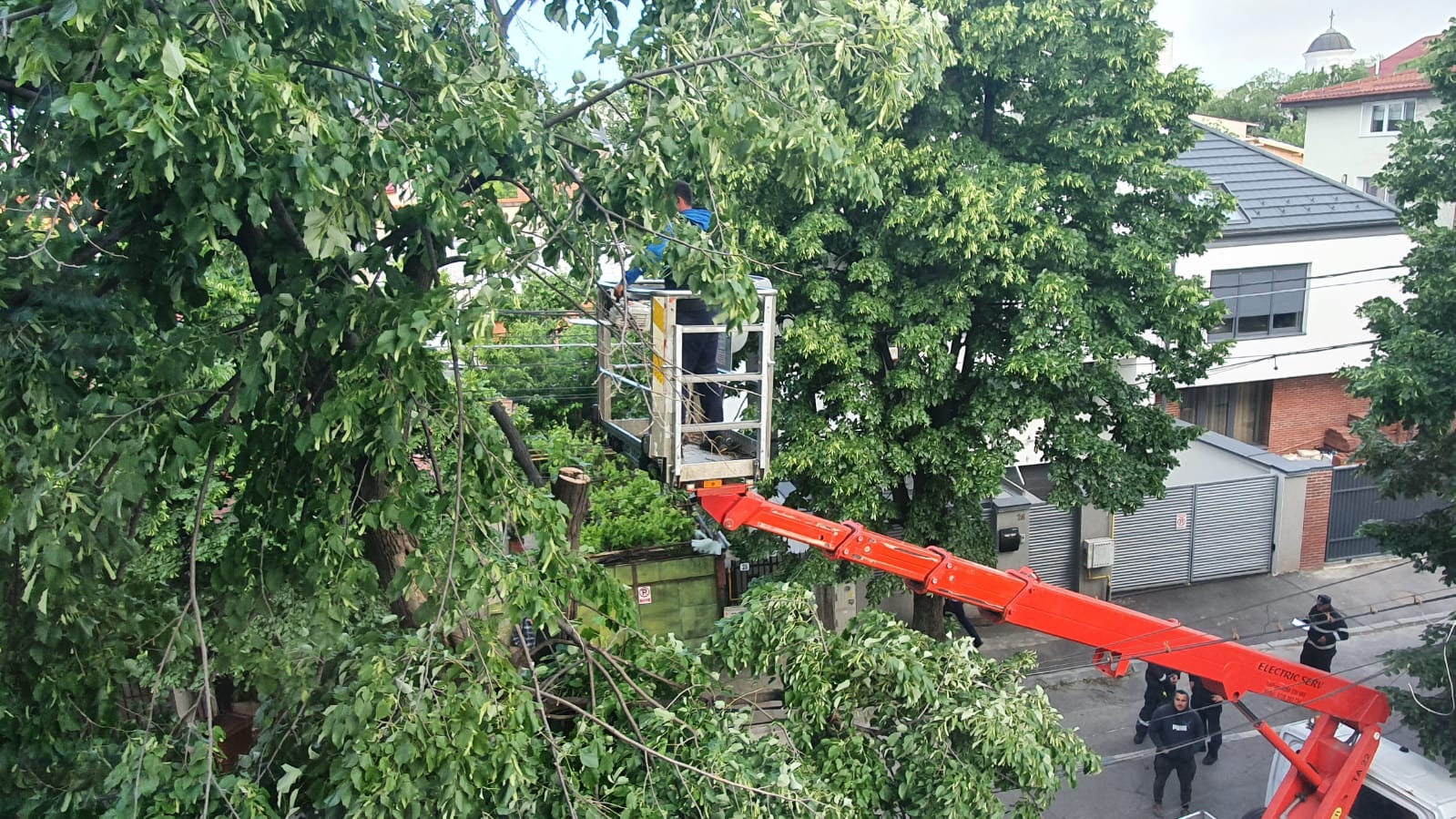 În Sectorul 1, pe strada Virgil Pleșoianu, unui tei bătrân cu înălțimea unui bloc cu 3 etaje i-a crăpat trunchiul în două, fiind în pericol să se prăbușească peste mașinile parcate, pe case și pe trecători.
