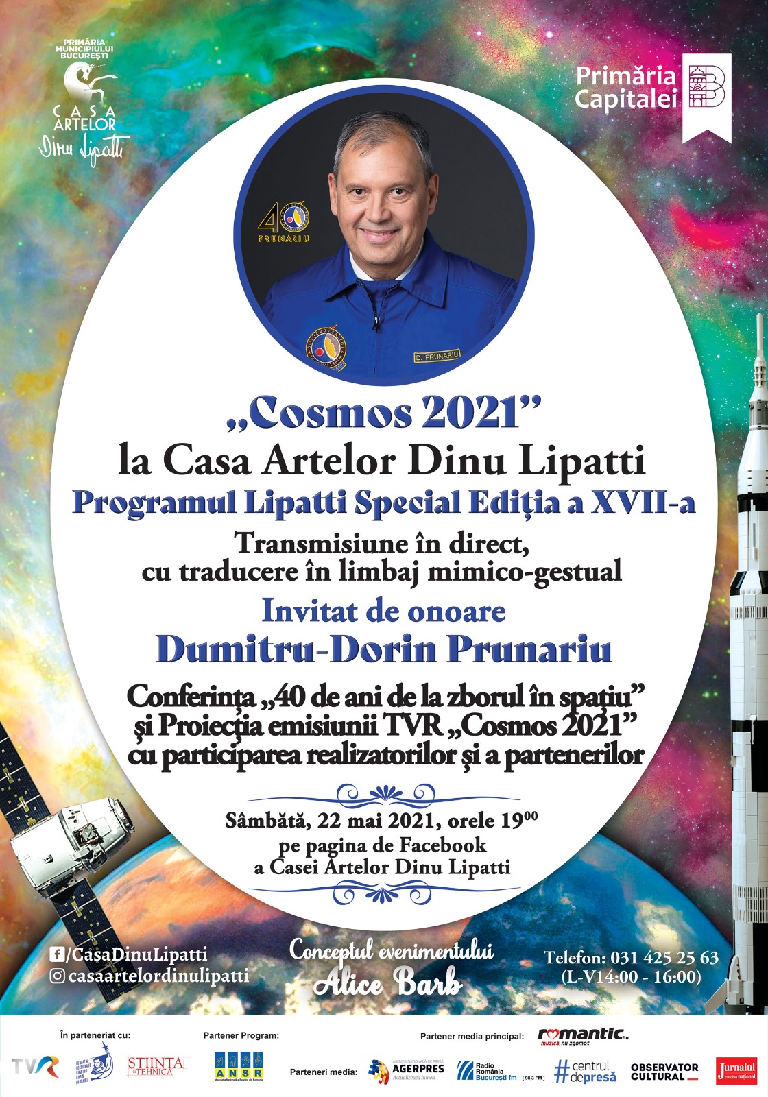 Așadar, sâmbătă, 22 mai 2021, de la orele 19:00 se va transmite, în direct, pe pagina de Facebook, Conferința „40 de ani de la zborul în spațiu”, susținută de cosmonautul Dumitru-Dorin Prunariu, alături de invitați – familie, parteneri și realizatori, iar la finalul Conferinței invitatul de onoare va răspunde întrebărilor adresate de către spectatori pe pagina de Facebook a Casei Artelor Dinu Lipatti.