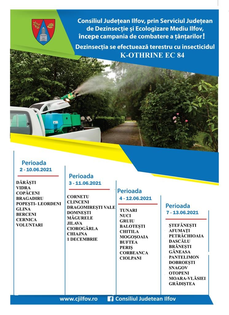 Consiliul Județean Ilfov anunță că, în perioada 2 -13 iunie, se va face dezinsecția pe cale terestră pentru combaterea insectelor de disconfort (țânțari adulți).