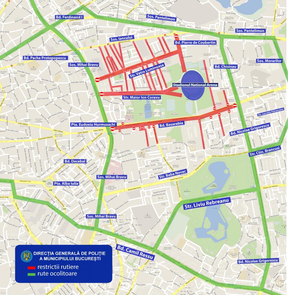 Joi, 17 iunie, de la ora 16.00, pe Arena Națională va avea loc meciul Ucraina-Macedonia de Nord, în cadrul Campionatului European de Fotbal – UEFA EURO 2020. Pentru buna desfășurare a evenimentului, de miercuri, 16 iunie, ora 07.00, se va interzice oprirea sau staționarea pe arterele care fac parte din perimetrul de siguranță, respectiv: