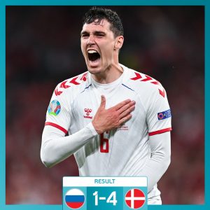 In prima repriza rușii au fost mai periculoși pe contraatac, însă scorul a fost deschis în minutul 38 de Damsgaard cu un șut fenomenal.