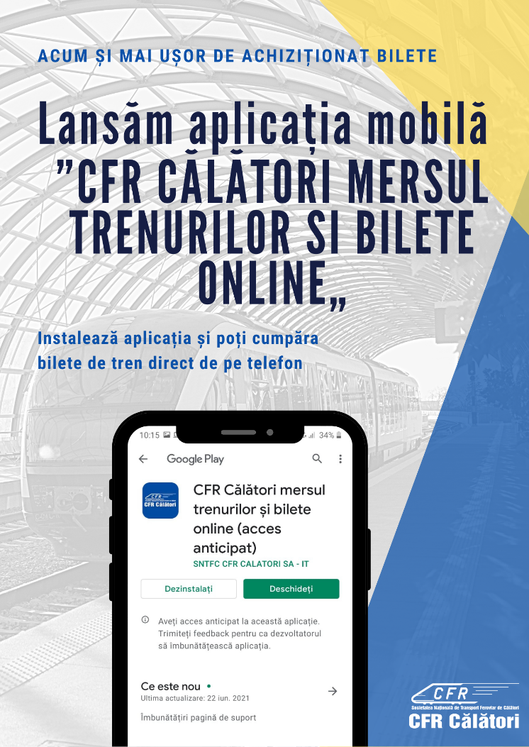 CFR Călători a lansat aplicația mobilă “CFR Călători mersul trenurilor și bilete online”. Utilizatorii au acces rapid la achiziționarea biletelor standard, dus-întors, dar și selectarea paturilor pentru vagoanele de dormit sau tip cușetă, adăugarea biletelor pentru animale de companie sau de bicicletă.
