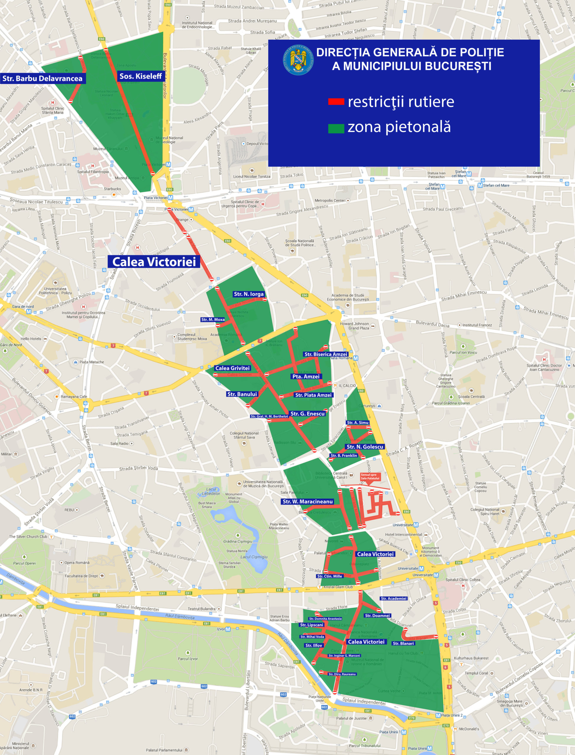 - restricționarea circulației rutiere pe străzile adiacente la Calea Victoriei și conform zonelor enunțate în cele de mai jos;