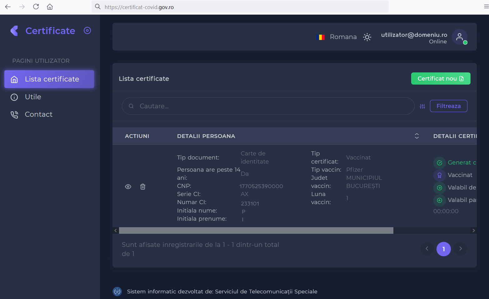 * Ulterior, în secţiunea “Listă certificate” se vor putea vizualiza toate certificatele emise de pe acel cont de e-mail.