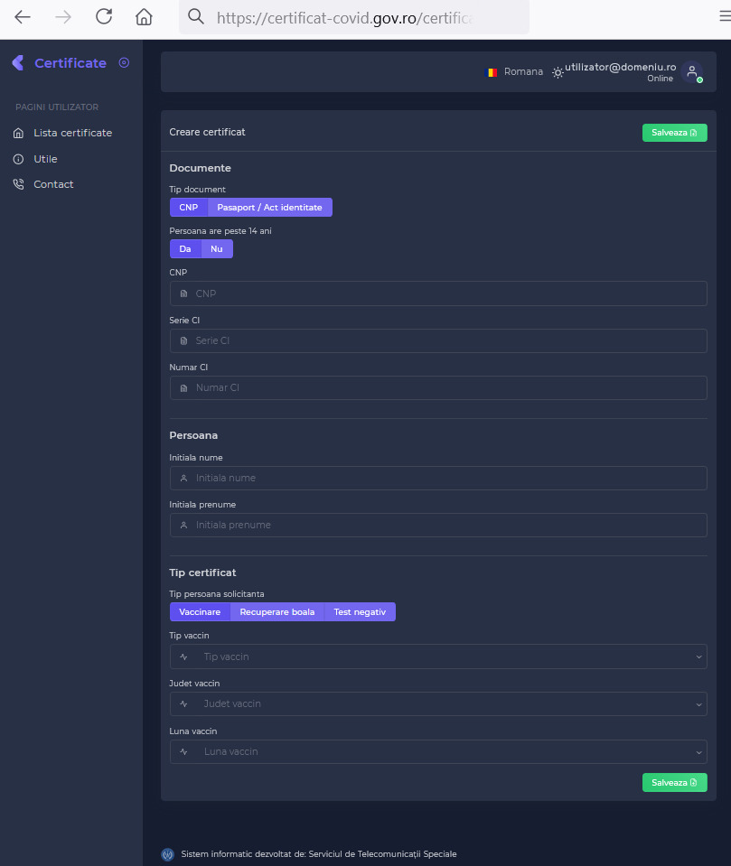 Interfaţa aplicaţiei este intuitivă, iar în mai puţin de 10 paşi poate fi obţinut certificatul: