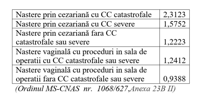 De exemplu, pentru o naștere, casa de asigurări de sănătate decontează spitalului cu care se află în contract tarife cuprinse între aproximativ 1.400 lei pentru o naștere normală, fără complicații, și aproximativ 3.400 lei pentru o naștere cezariană, cu complicații grave.