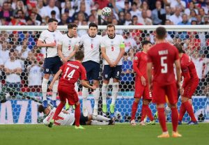 Danezii au deschis scorul pe Wembley cu un gol superb marcat de Mikkel Damsgaard direct din lovitură liberă (prima astfel de reușită la acest turneu final de Campionat European).
