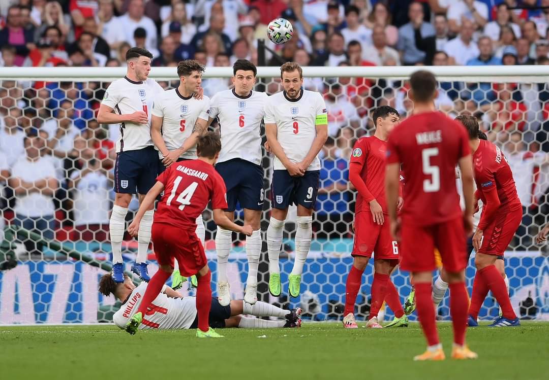 Danezii au deschis scorul pe Wembley cu un gol superb marcat de Mikkel Damsgaard direct din lovitură liberă (prima astfel de reușită la acest turneu final de Campionat European).