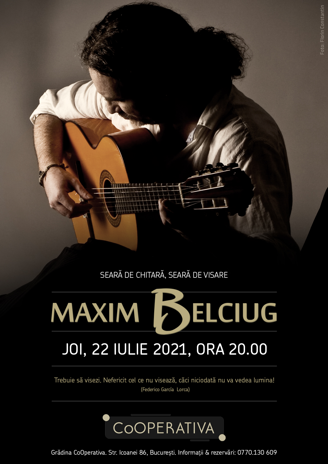 Joi, 22 iulie, de la ora 20:00, iubitorii de finețuri muzicale sunt poftiți în grădina CoOperativa pentru un recital extraordinar susținut de Maxim Belciug, chitaristul Încântărilor. Trebuie să visezi.