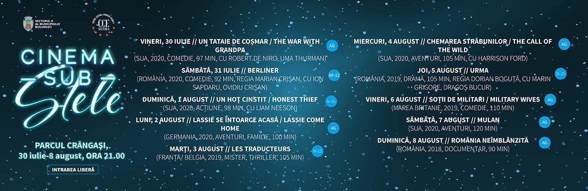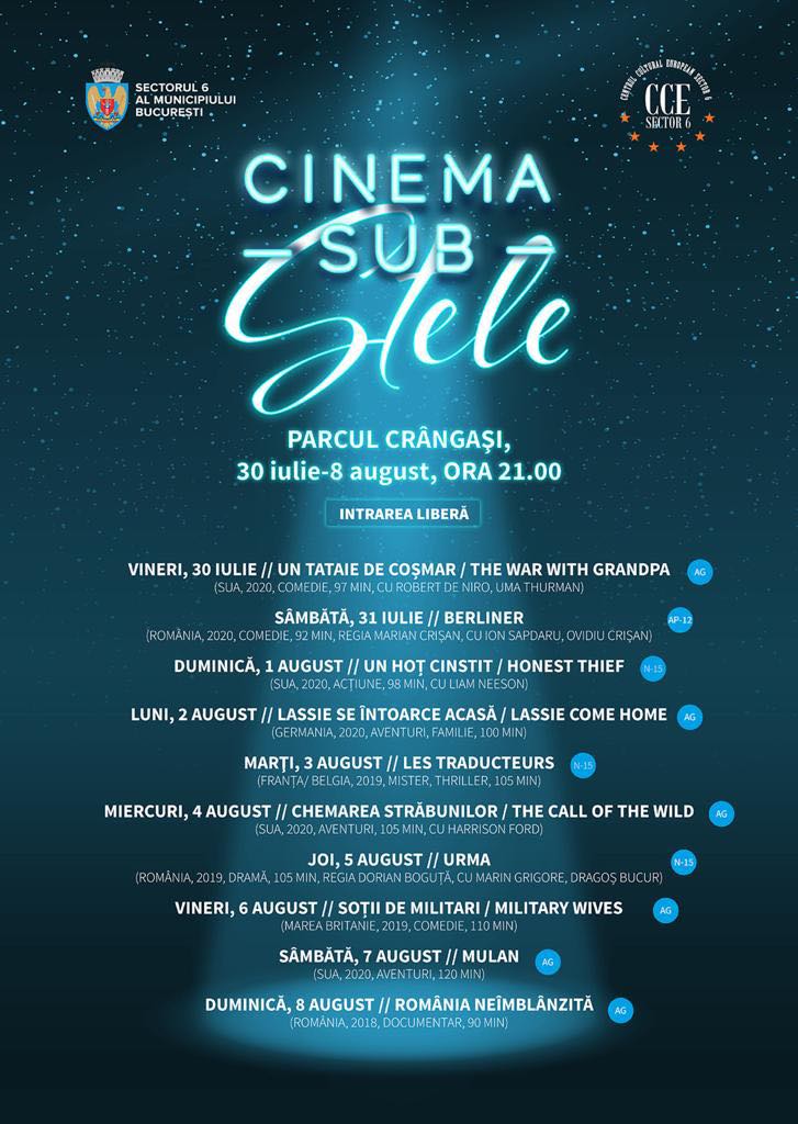 În Parcul Crângași, începând de mâine și până duminică (8 august), în fiecare seară, de la ora 21:00, are loc evenimentul „Cinema sub stele”.