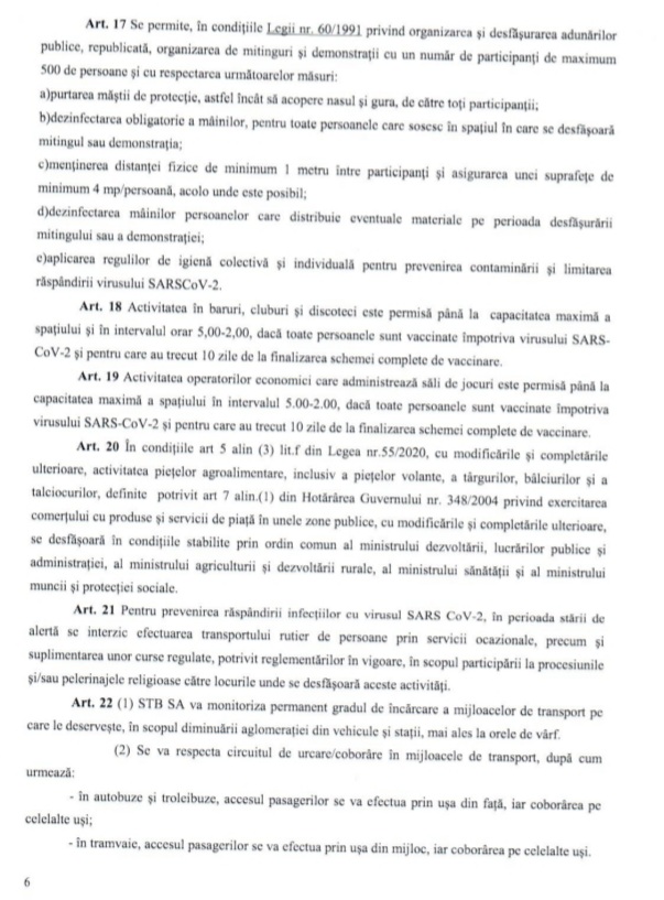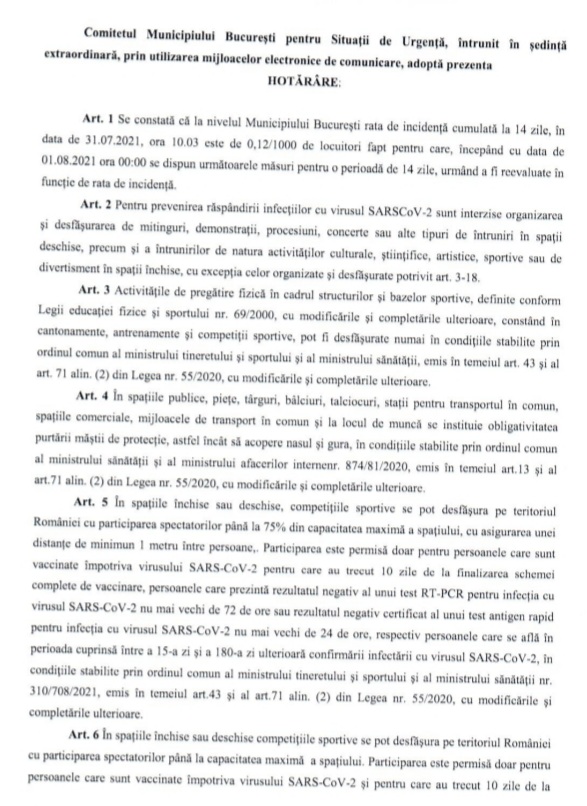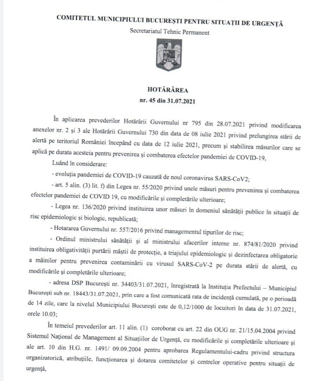 Astăzi, 31 iulie 2021, a avut loc şedinţa extraordinară a Comitetului Municipiului Bucuresti pentru Situatii de Urgenta, în cadrul căreia a fost adoptată Hotărârea nr. 45 din 31.07.2021 care prevede noile masuri, valabile de la 1 august, în contextul stării de alertă, in capitala.