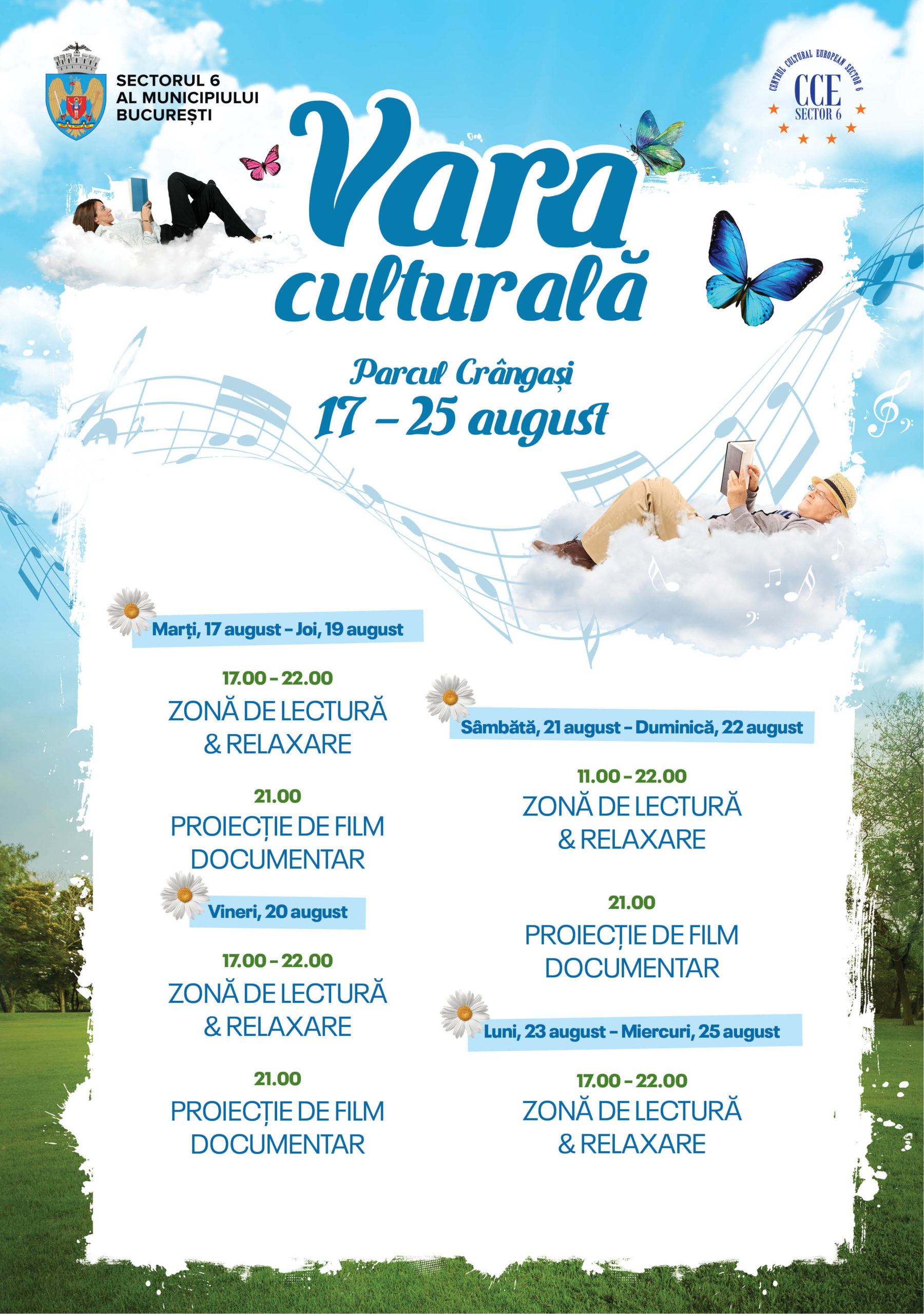 Între 17 și 25 august, în Parcul Crângași din Sectorul 6, vor avea loc la proiecții de filme documentare, lectură și relaxare la Vara Culturală!