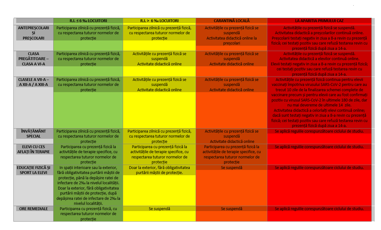 „Scenariile stabilite sunt în cea mai mare parte cunoscute. După depășirea ratei de infectare de 6 la mia de locuitori, cursurile trec în online. Nu vor mai fi permise nici măcar activitățile remediale. Documentul care este în formă finală, dar va fi semnat atunci când cei doi miniștri vom fi abilitați de CNSU. Credem că am acoperit toate situațiile posibile”, a declarat ministrul Educației, Sorin Cîmpeanu.