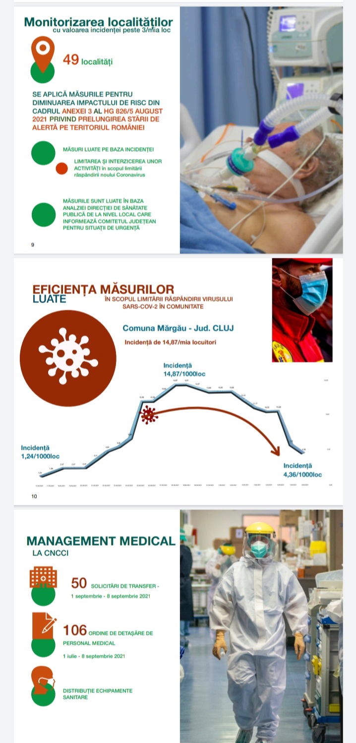 Avem un exemplu: comuna Mărgău din judeţul Cluj, care atinsese aproape de 15 la mie incidenţa şi vă reamintesc că numai incidenţa este la baza deciziilor, este un punctaj mai complex care se face pentru a lua o decizie, dar acum este la 4,36 deja incidenţa, deci a scăzut după aplicarea mai multor măsuri în zona respectivă.