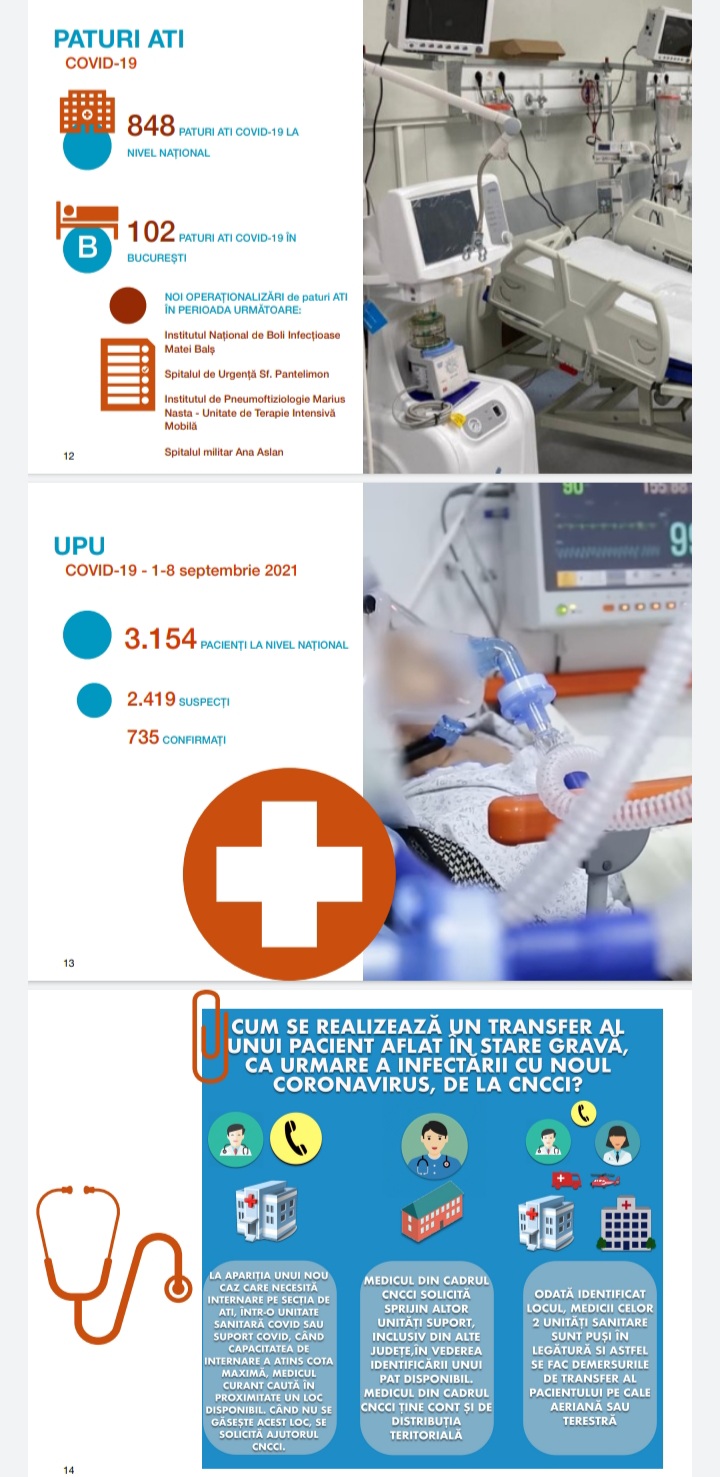 Astfel, Ministerul Apărării ne-a confirmat că de mâine Spitalul “Ana Aslan”, ROL 2, cum era cunoscut, va relua activitatea de terapie intensivă şi de mâine, după-masă, vom avea acces la încă 12 paturi de terapie intensivă, urmând să crească la 23, într-o scurtă perioadă, şi mai avem mai multe locaţii unde urmează să crească numărul paturilor de terapie intensivă în următoarele zile, prin detaşare de personal sau chiar şi de echipamente medicale şi aici vorbim: Institutul Naţional de Boli Infecţioase “Matei Balş”, Spitalul de Urgenţă “Sf. Pantelimon”, Spitalul Universitar de Urgenţă şi Institutul de Pneumoftiziologie “Marius Nasta”, unde urmează să fie reinstalată unitatea mobilă de terapie intensivă.