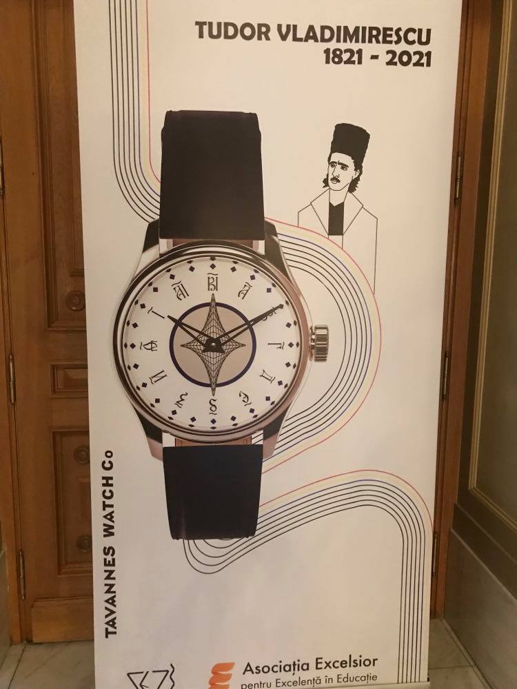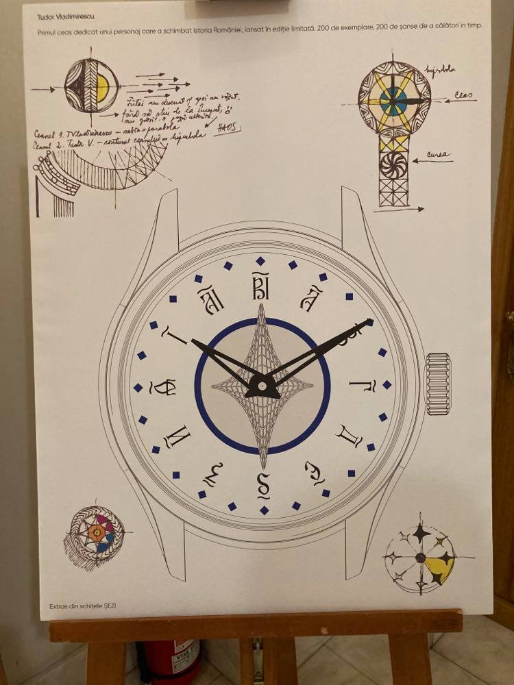 Cadranul ceasului „Tudor Vladimirescu” reflectă frânturi din trecutul istoric. Simbolul geometric central reprezintă o parabolă și este inspirat din mânerul sabiei lui Tudor. În același timp, la nivel lexical, parabola este o pildă care dăinuie. Cifrele chirilice amintesc de textul scris pe steagul de mătase al Revoluției din 1821, dar și pe Proclamația de la Padeș. Cercul cu reflexii albastre este imaginea stilizată a inelului din aur primit de Tudor Vladimirescu de la părinții lui. Romburile reprezintă pandurii, care protejează întregul dans al elementelor din cadran. Îmbinând tradiția cu inovația, acest ceas te poartă prin momente care au influențat prezentul.