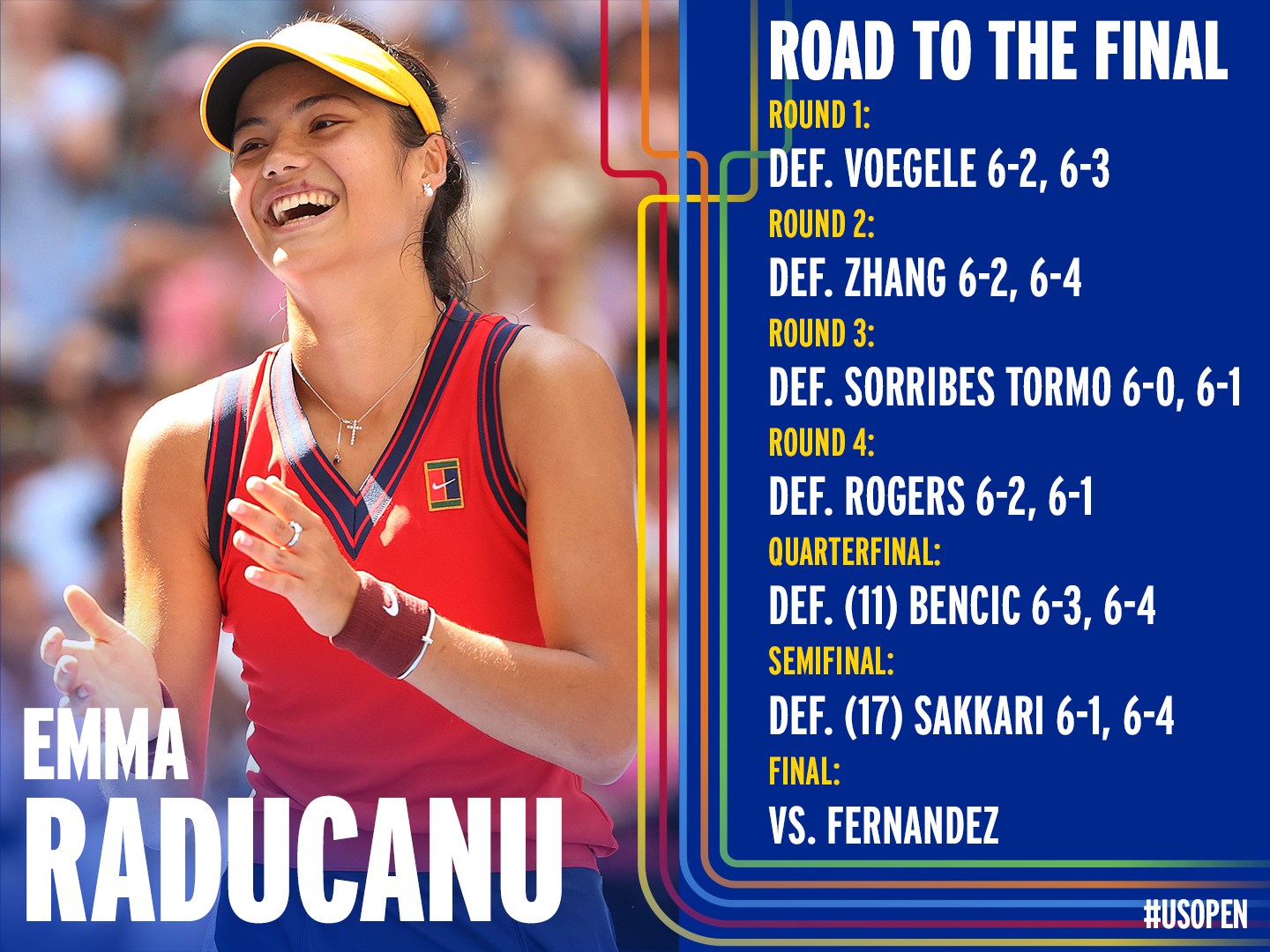 La rândul său, canadianca Leylah Fernandez (78 WTA) s-a calificat în finală după ce a trecut de Aryna Sabalenka din Belarus cu 7-6, 4-6, 6-4.