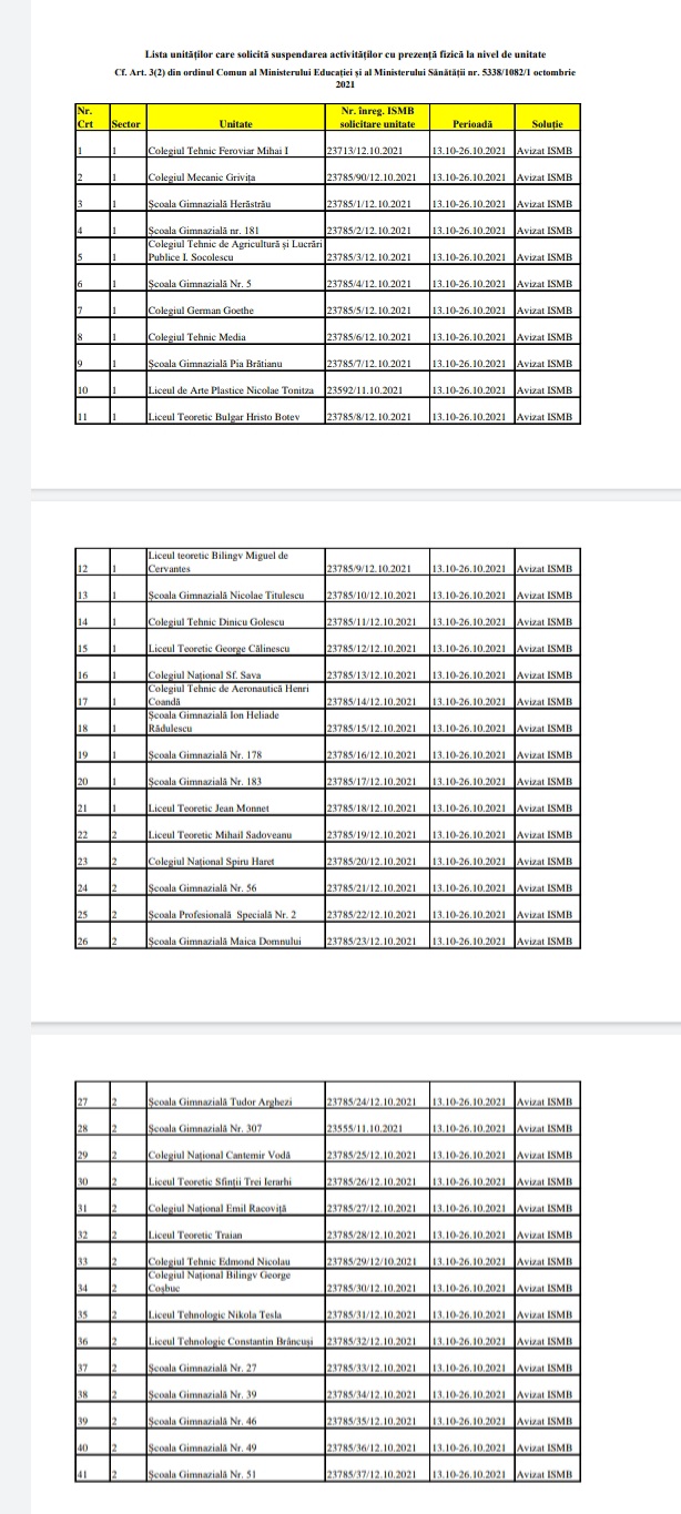 ,,Până la această oră, Inspectoratul Şcolar al Municipiului Bucureşti a primit 100 de cereri de suspendare a activităţii cu prezenţă fizică. Este vorba despre 91 de cereri în baza articolului 3 alineat 2 şi nouă cereri de suspendare activităţii în baza articolului 6 alineat 9. Practic este vorba despre aproape un sfert din şcolile din Capitală în sistem online”, a declarat Sorin Cîmpeanu, într-o intervenţie telefonică la Digi 24.